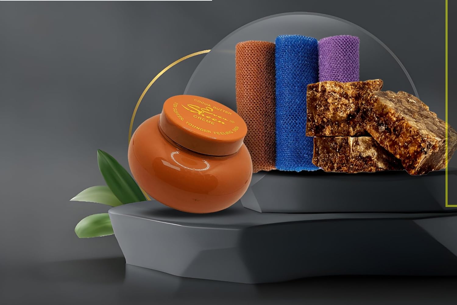 African Black Soap, African Exfoliating Net Sponge and Queen Elizabeth Cocoa Butter Set Natural Skincare Gift Bundle for Deep Cleansing and Glowing Skin