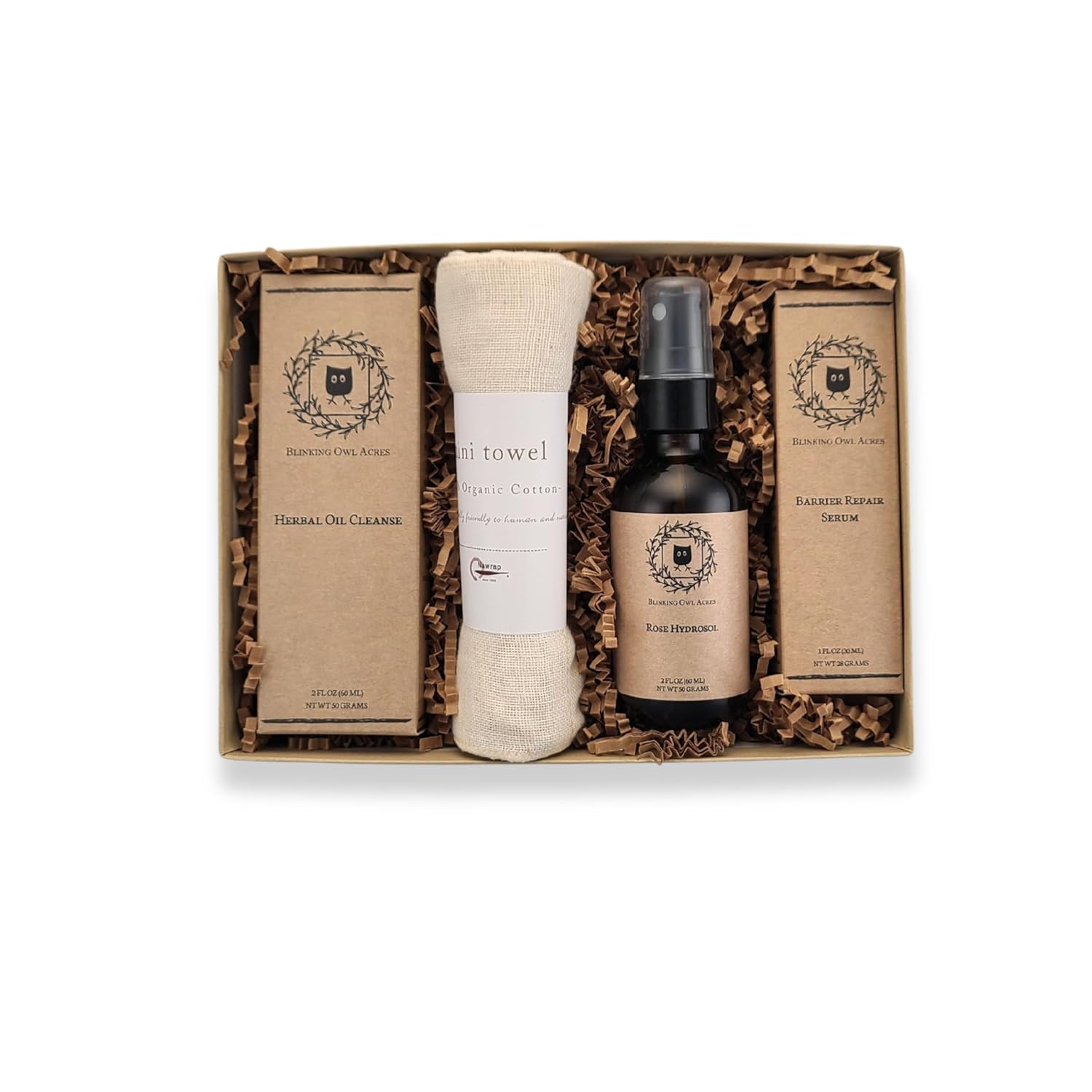 Skin Detox Kit, Blinking Owl Acres Holistic Skin Care Set, Herbal Oil Cleanser, Barrier Repair Serum, Rose Hydrosol, Washcloth