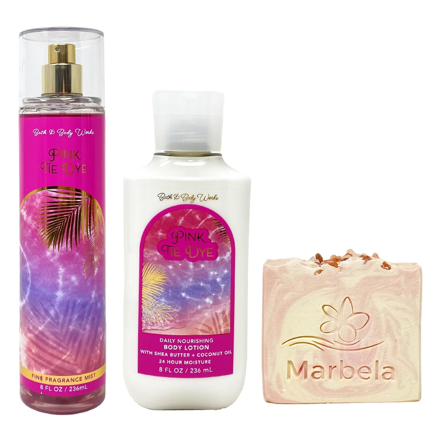 Bath & Body Works Pink Tie Dye Fragrance Mist and Body Lotion Duo Set with a Himalayan Salts Springs Bar Soap