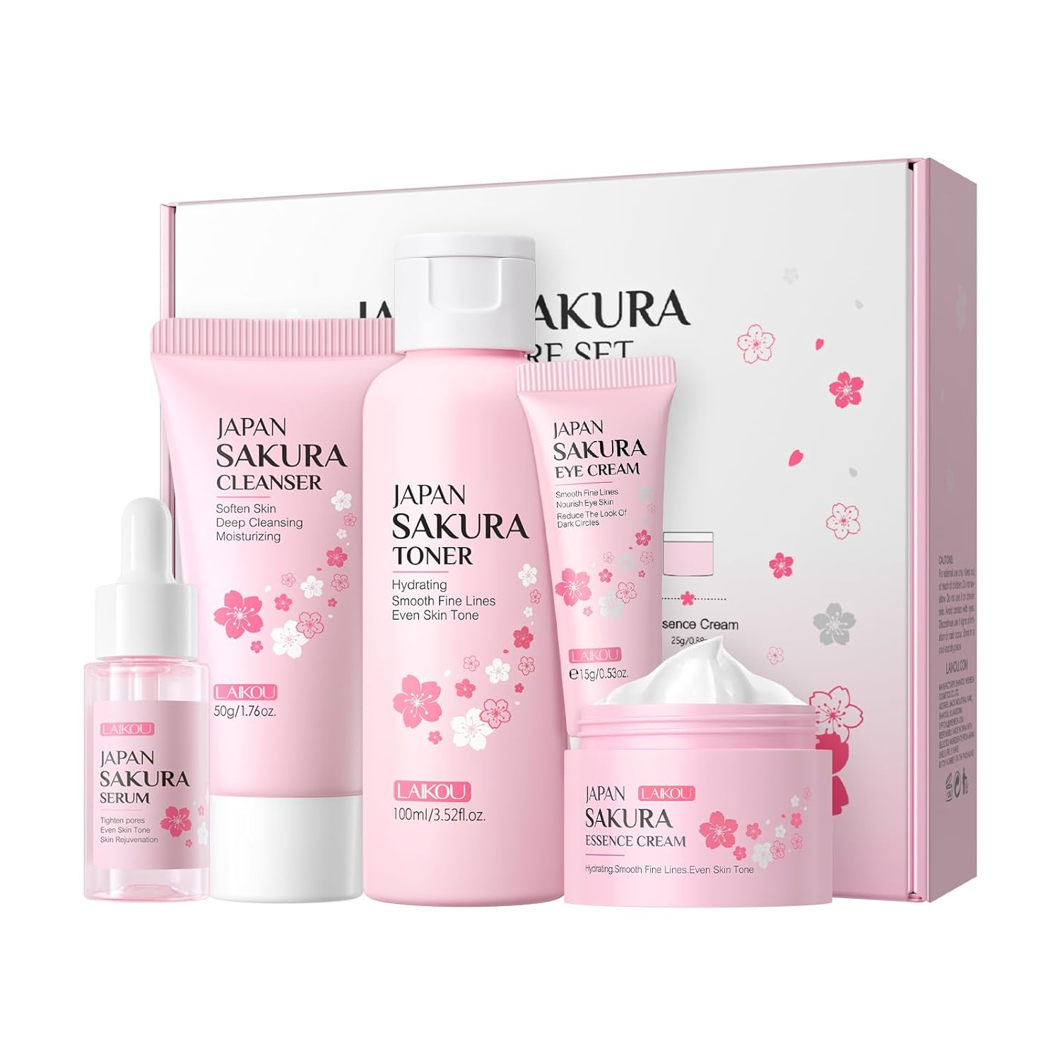LAIKOU Skin Care Set, Facial Skin Care Products, Skin Care Kit with Sakura Serum, Cleanser, Toner, Eye Cream, Essence Cream 5pcs for Women Teen Girls Mom Daughter Lover Mother's Day Birthday Christmas