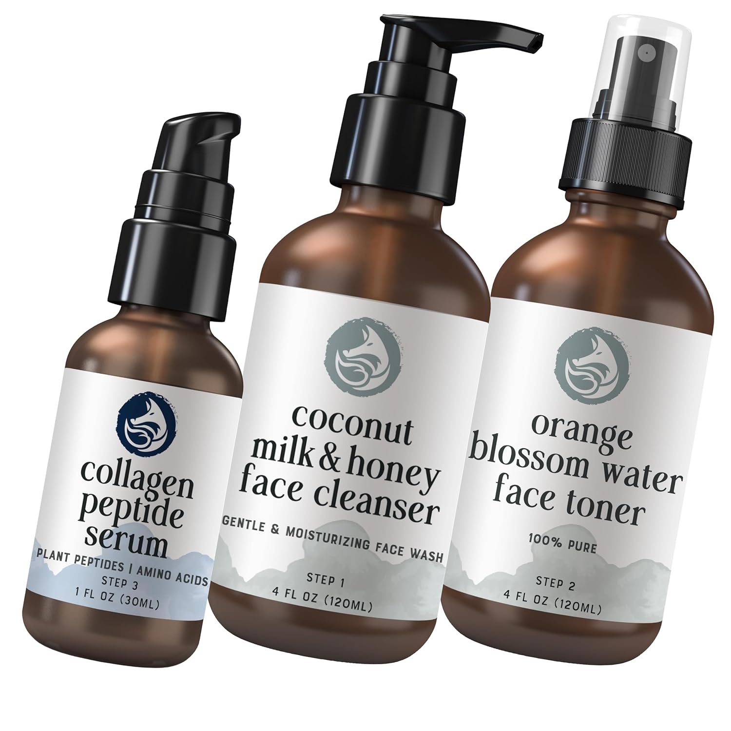 Foxbrim Naturals Ultimate Radiance Skincare Bundle: Peptide Collagen Serum, Coconut Milk & Honey Cleanser, and Orange Blossom Water Toner