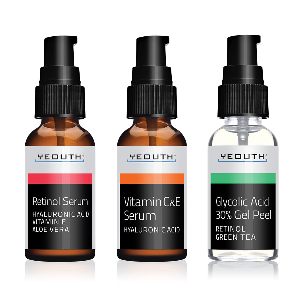 YEOUTH Face Set Includes Retinol Serum, Vitamin C Serum, Glycolic Acid Exfoliate Peel, Anti Aging Face Serums for Brightening & Wrinkle, Anti Aging Serum Set, Facial Skin Care Products 3-pack
