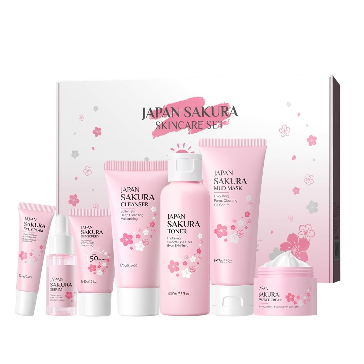 Skin Care Set Sakura Beauty Gift Sets Skin Care Kit with Cleanser,Mud Mask,Toner, Face Serum,Eye Cream,Face Cream,Sunscreen Travel Kit for Teen Girls Birthday Gift 7pcs Set