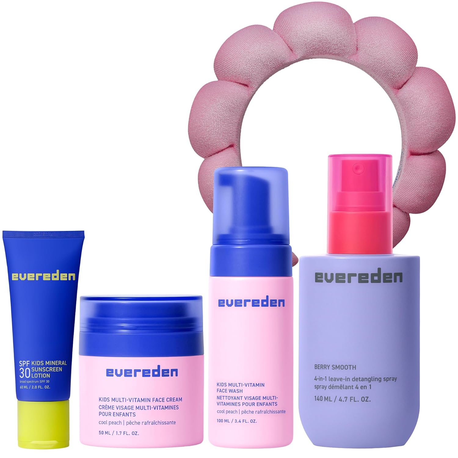 Evereden Kids Skincare Set – Trio Routine with Peach Face Wash & Cream, SPF 30 Mineral Sunscreen, Detangling Spray & Spa Headband – Gentle, Nourishing Daily Self-Care for Kid