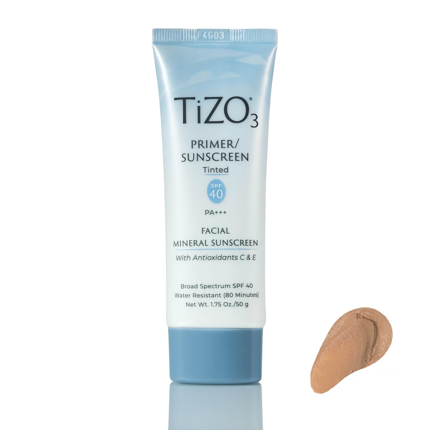 TiZO3 Facial Mineral Sunscreen and Primer, Tinted Broad Spectrum SPF 40 with Antioxidants, Sheer matte finish, Fragrance-Free, Oil-Free, Dermatologist-recommended, PA+++ 1.75 oz