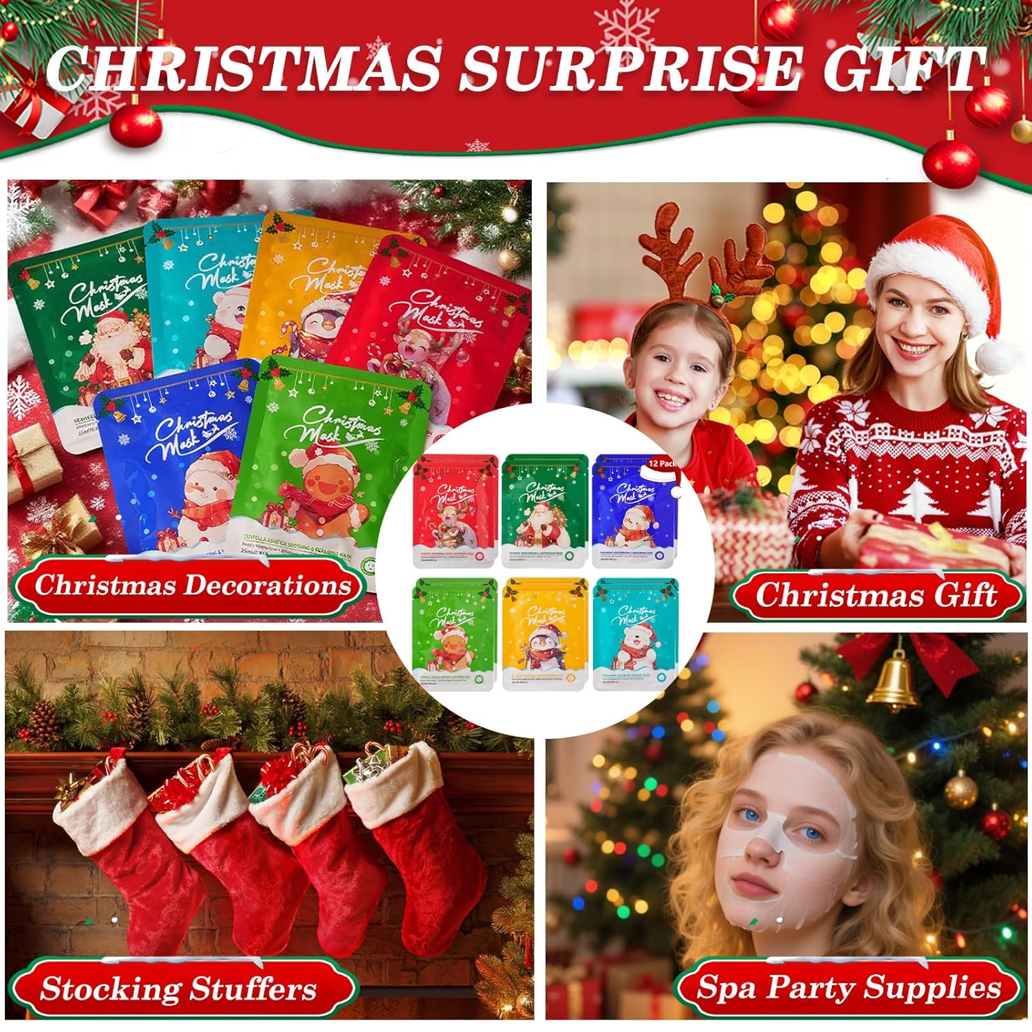 CHRISTMAS STOCKING STUFFERS - 12 PACK FACIAL MASKS: Our Christmas facial mask skin care set contains 12 pieces facial masks featuring 6 holiday-themed designs. Suitable for your daily skin care routine, and can be shared with friends at Christmas parties, girls' nights and ladies' nights with friends, enhancing the festive atmosphere and skincare experience to savour celebratory moments.
