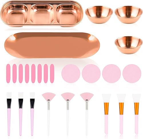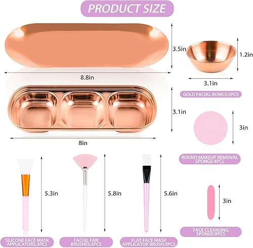 Esthetician Supplies Kit:You will get a pack of 26-piece esthetics supplies, including 3 gold facial bowls(3.1''×1.2''), 3 facial fan brushes(5.8''), 3 flat face mask applicator brush(5.6''), 3 silicone face mask applicators(5.3''),1 gold three-grid rectangle dish(8''×3.1''), 1 gold stainless steel small tray(8.8''×3.5'') and 12 pieces of yellow compressed sponge strips;You can choose different styles according to your needs.