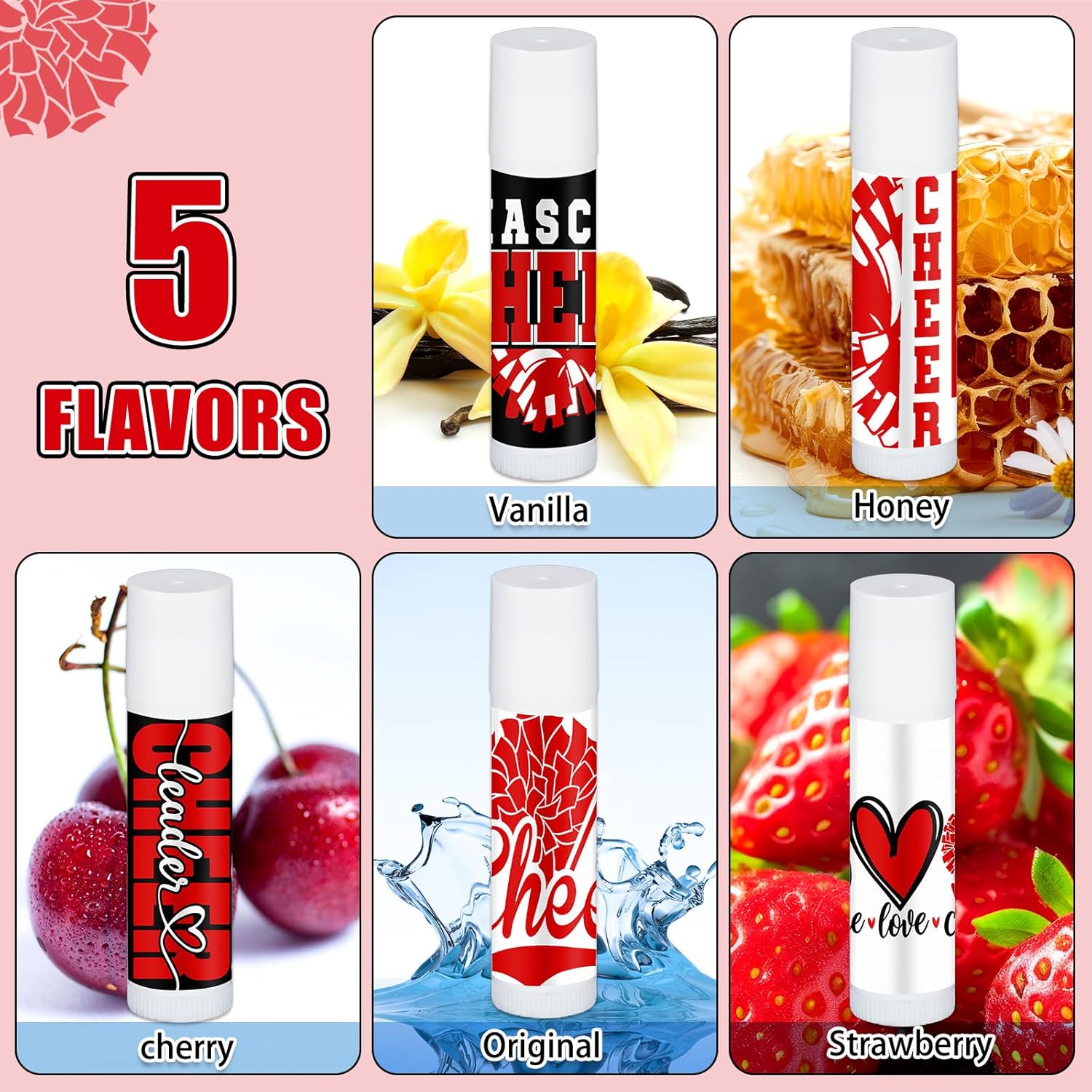 Red Cheer Team Theme Design: show off your team spirit with our distinctively designed red lip balm; 30 pack lip balms in this bulk cheer gift set is adorned with 5 unique cheer theme, making them perfect cheer awards; Let your passion for the sport shine with these cheerleader gifts bulk