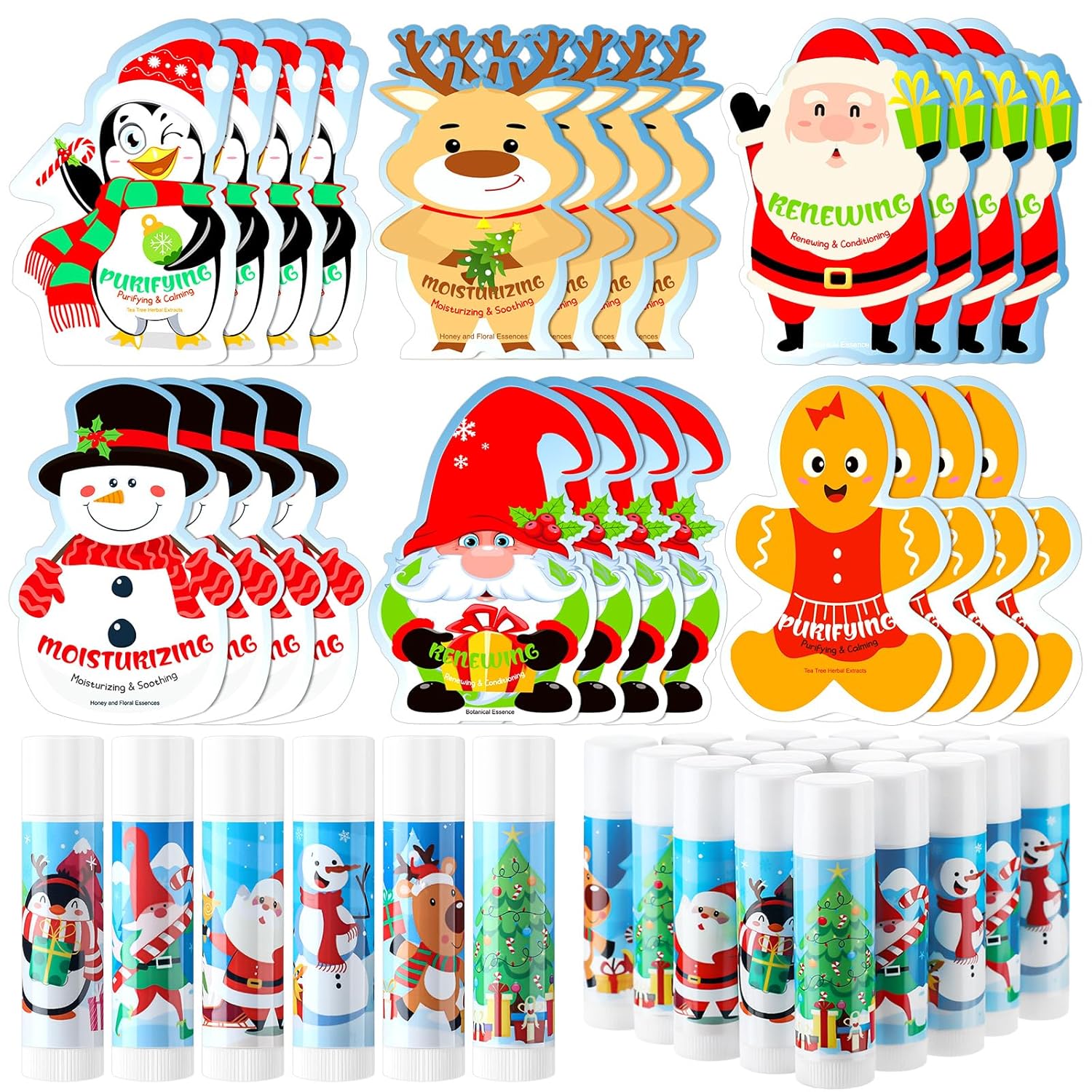 Christmas Stocking Stuffers: this skincare Christmas set includes 24 Christmas lip balms bulk in 6 styles and 24 Christmas facial masks in 6 styles, 4 pcs for each style, all in the theme of Christmas; Providing lip and skincare needs with convenience during the holiday season, you can also share them with friends or family