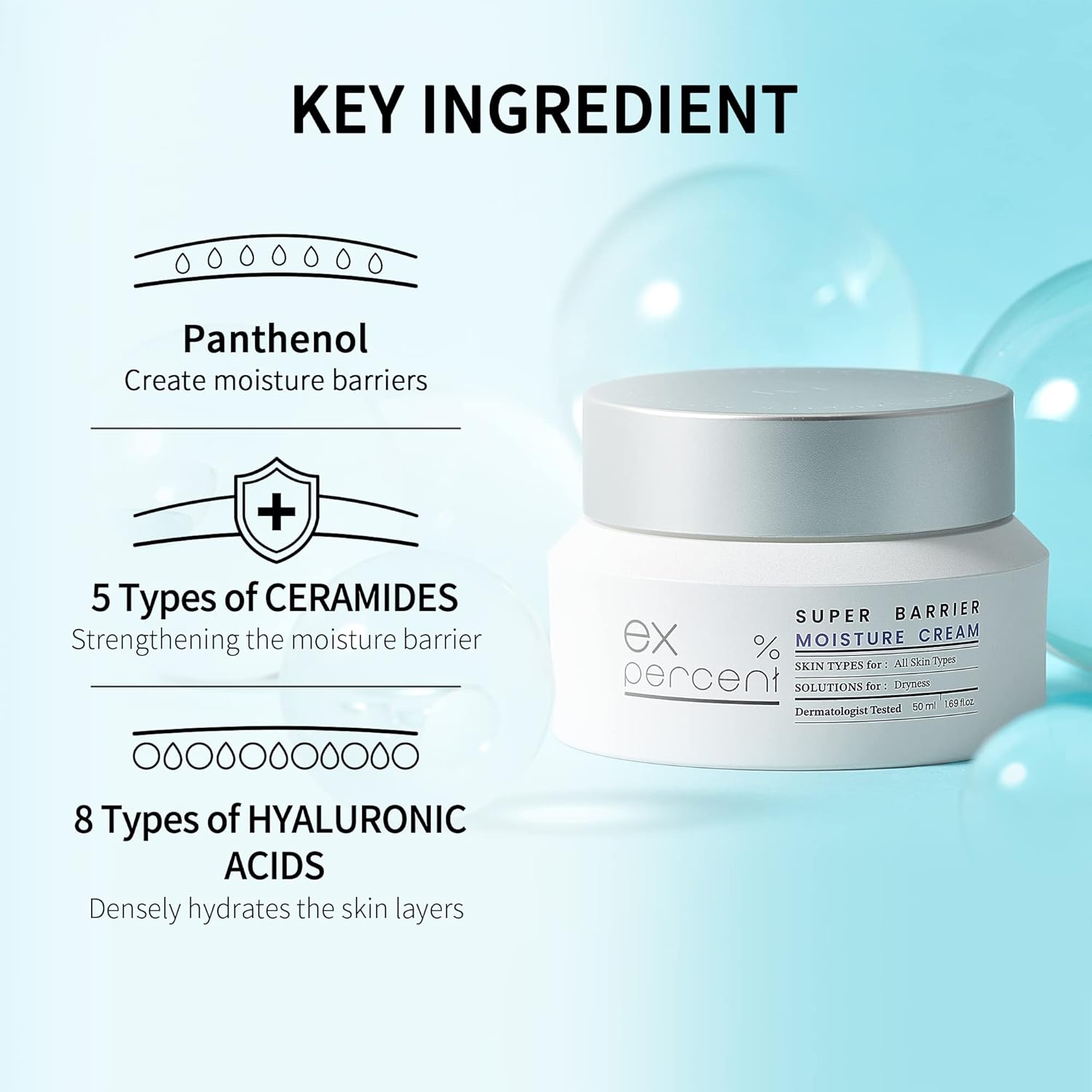 Formation and strengthening of skin moisture protection film with three layers of moisture coating. Contains 8 types of hyaluronic acid, called water reservoir (increases absorption rate for each layer of skin) ,Encapsulate five ceramides called moisture shields to increase skin absorption , Panthenol moisturizing, repairing, and calming effects called hydration magnets