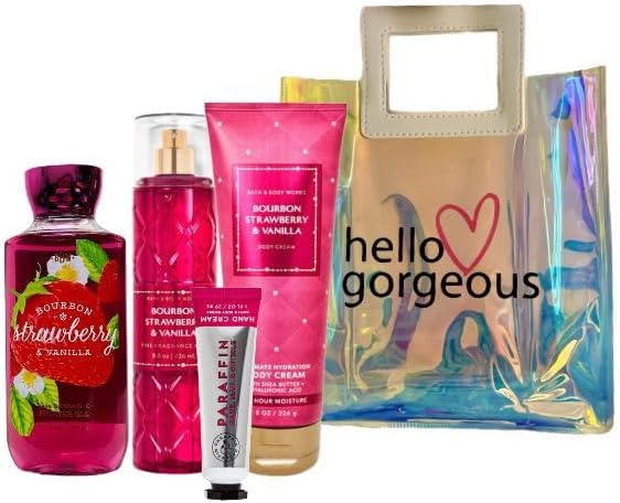 White Barn - Bath and Body Works - Gift Set 4 Piece Bundle - with Gift Bag Hello Gorgeous (Bourbon Strawberry & Vanilla)
