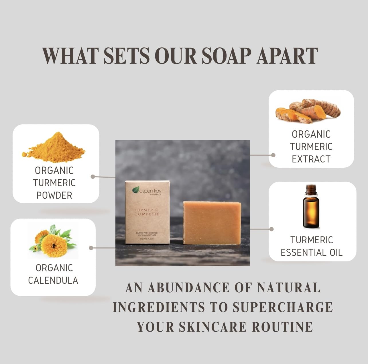 Our Aspen Kay Naturals Turmeric Soap is called Turmeric Complete. This is due to the abundance of turmeric in this soap. It contains organic turmeric powder, organic turmeric extract and turmeric essential oil, organic chamomile and calendula.
