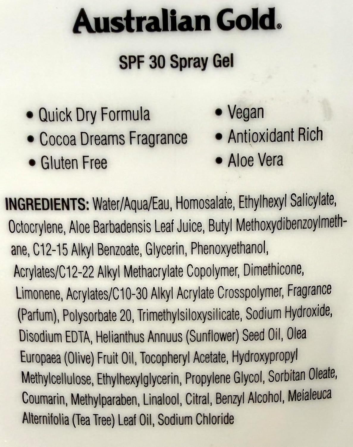 Comment on "Australian Gold Spray Gel Sunscreen, SPF 30, 8 Ounce | Moisture Max | Infused with Aloe Vera | Broad Spectrum | Water Resistant(Moisture Max,8 Fl Oz (Pack of 1))"