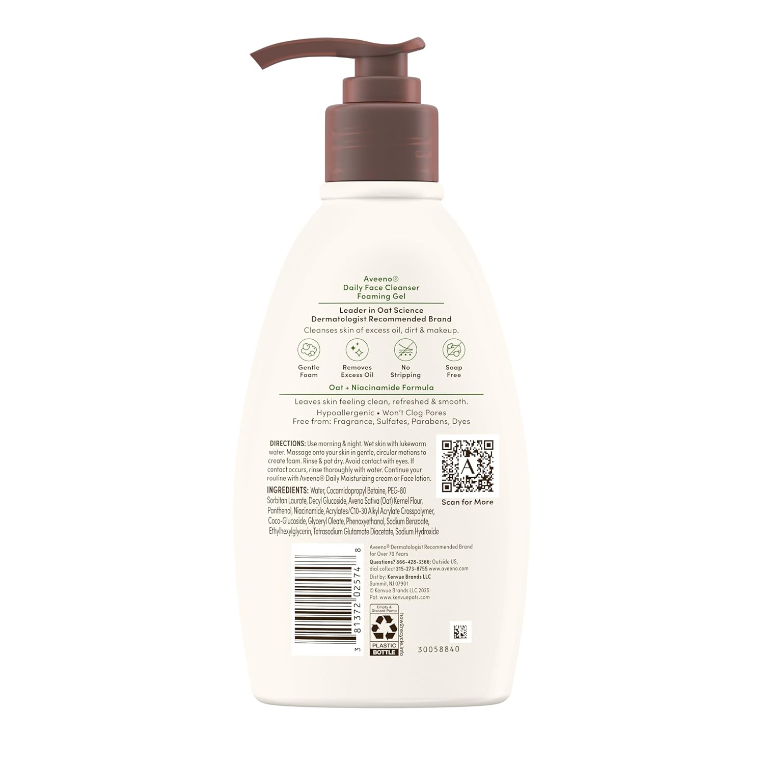 12-fluid ounces of Aveeno Face Cleanser Foaming Gel with oat and niacinamide removes excess oil without disrupting the skin's moisture barrier and does not leave skin feeling stripped