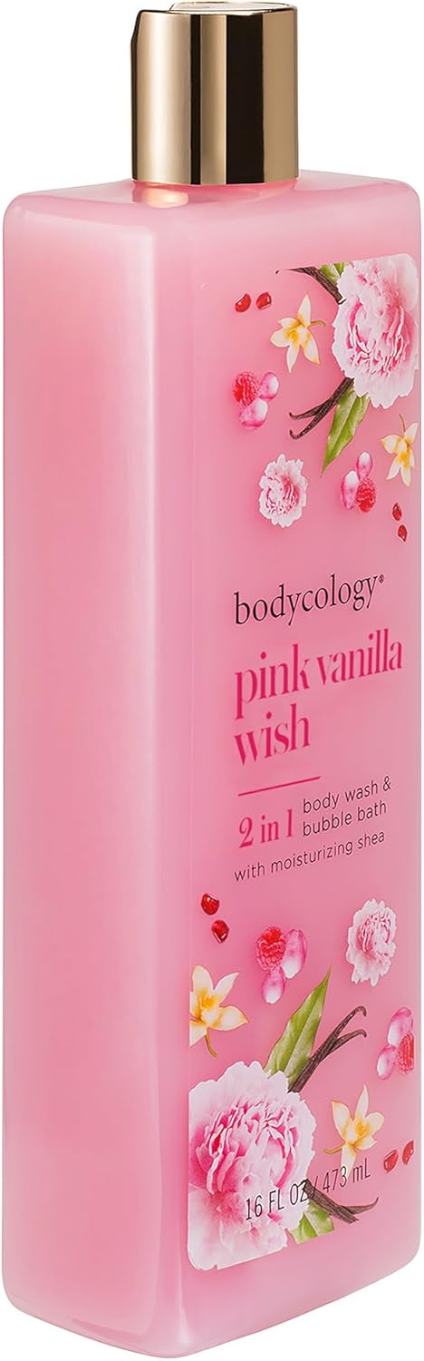 The Bodycology 2-In-1 Body Wash and Bubble Bath features shea butter and vitamin E and has a delicious scent of sparkling blend of warm vanilla, almond and pink peony