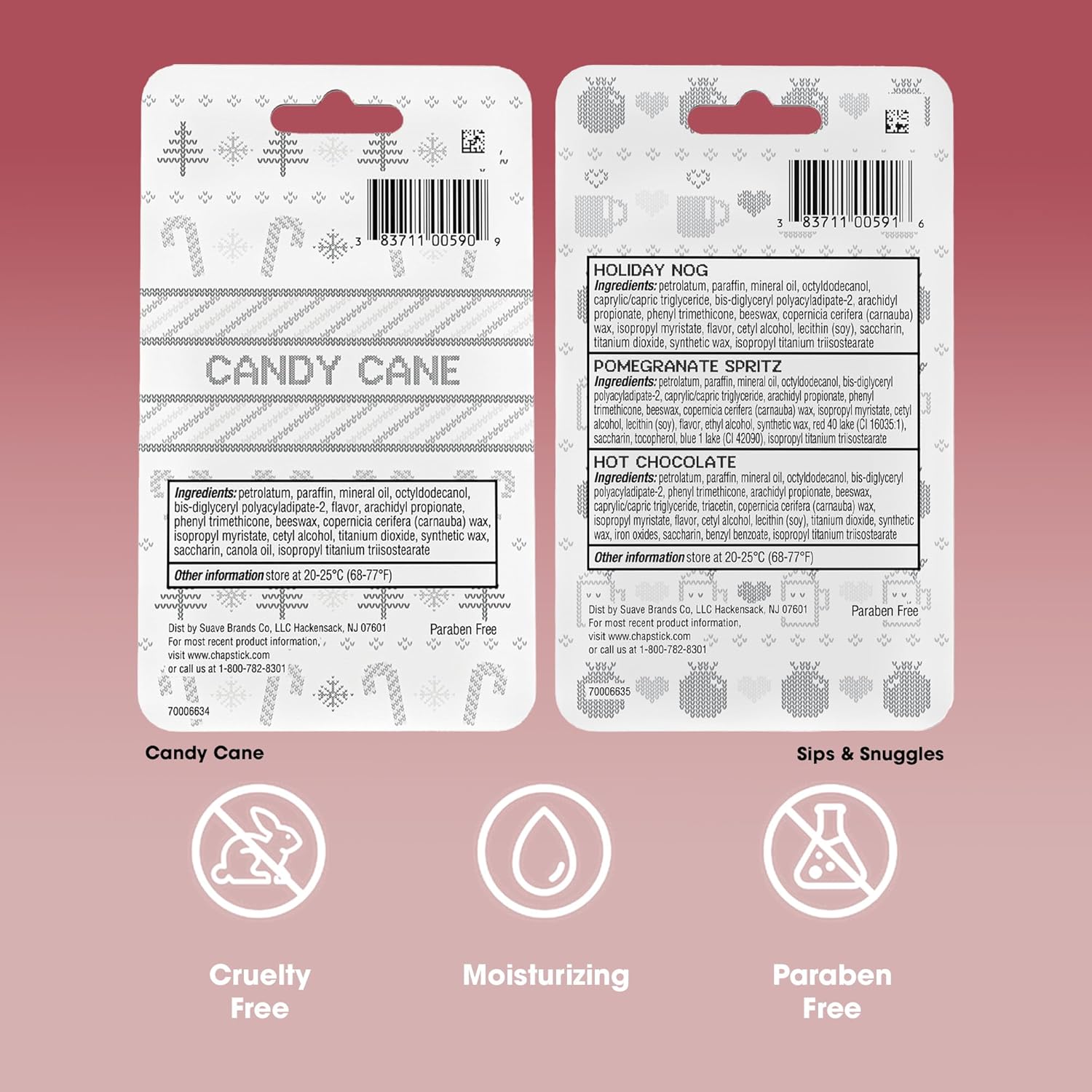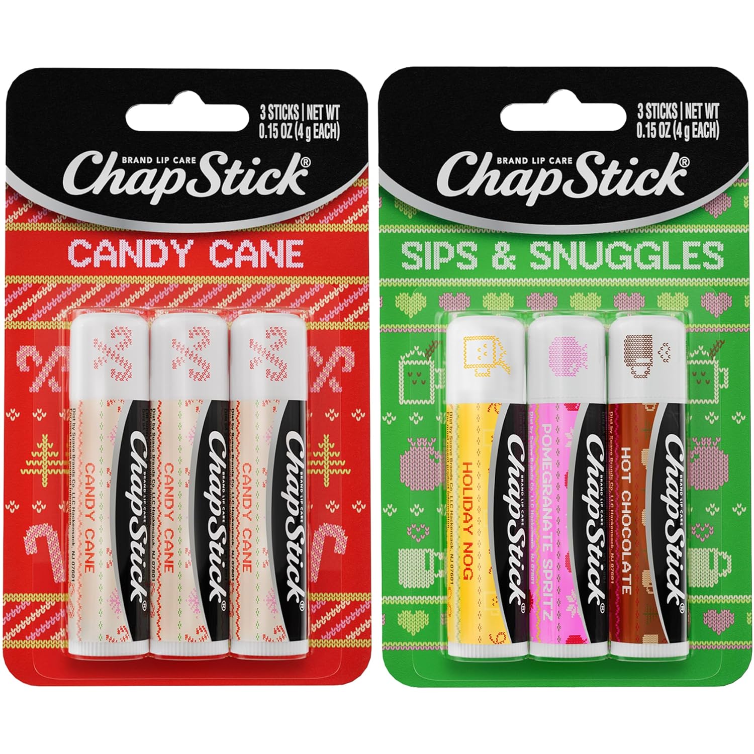 CHAPSTICKS FOR GIFTING: Celebrate the season with a cozy collection of ChapStick packs: Candy Cane and Sips & Snuggles (Holiday Nog, Pomegranate Spritz, Hot Chocolate) in holiday-themed packaging.