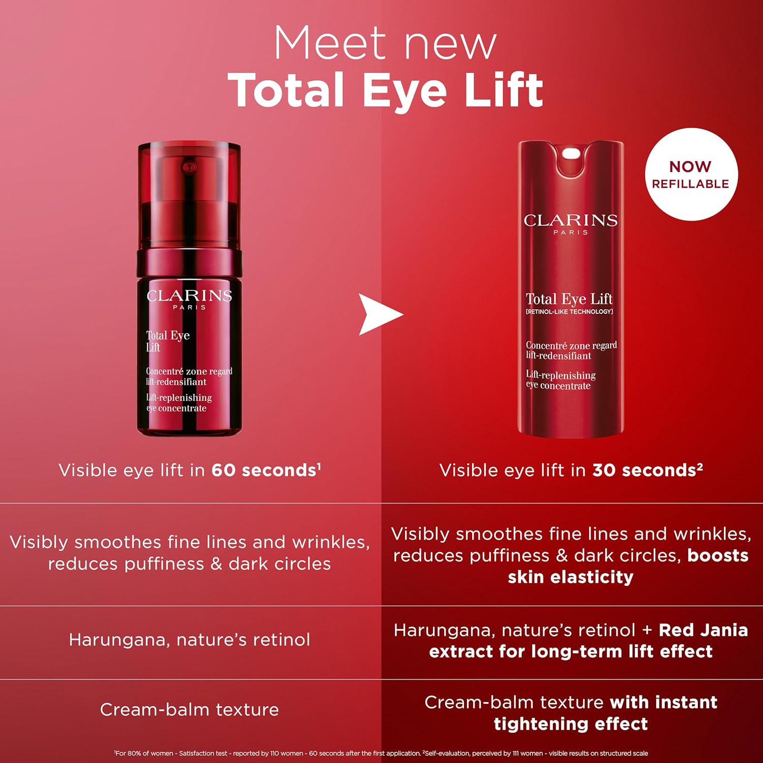 Comment on "Clarins NEW Total Eye Lift | Anti Aging Eye Cream | Targets Wrinkles, Crow's Feet, Dark Circles and Puffiness For a Visible Eye Lift in 30 Seconds | REFILLABLE(Total Eye Lift Refill 0.5 Oz- Only Dispenses with New Total Eye Lift Bottle)"