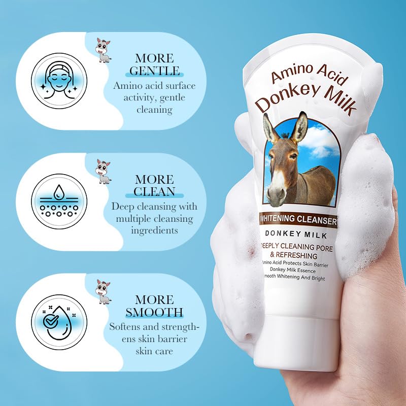 EFFICACY: With a mild formula of amino acids,the Amino Acid Donkey Milk Cleanser foam is rich and dense, deep into the pores to clean the s kin dirt. At the same time, it can remove the residual makeup Can be used as a makeup remover, refreshing and oil controlling,and make the skin clean transparent
