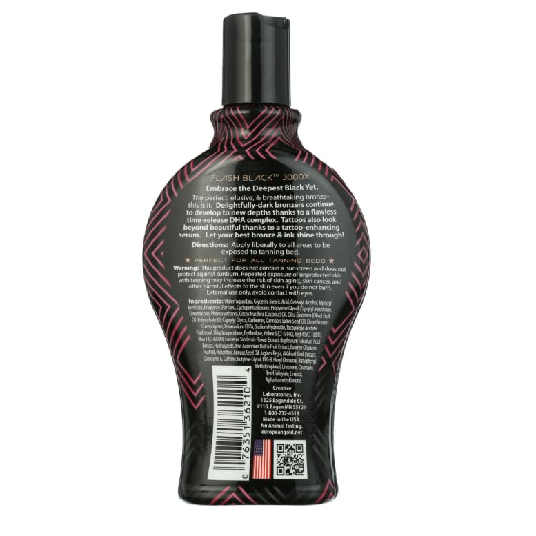 Achieve a Radiant Tan: The European Gold Flash Black 3000X indoor tanning lotion promises a deep, natural-looking tan while keeping your tattoos vibrant and bold.