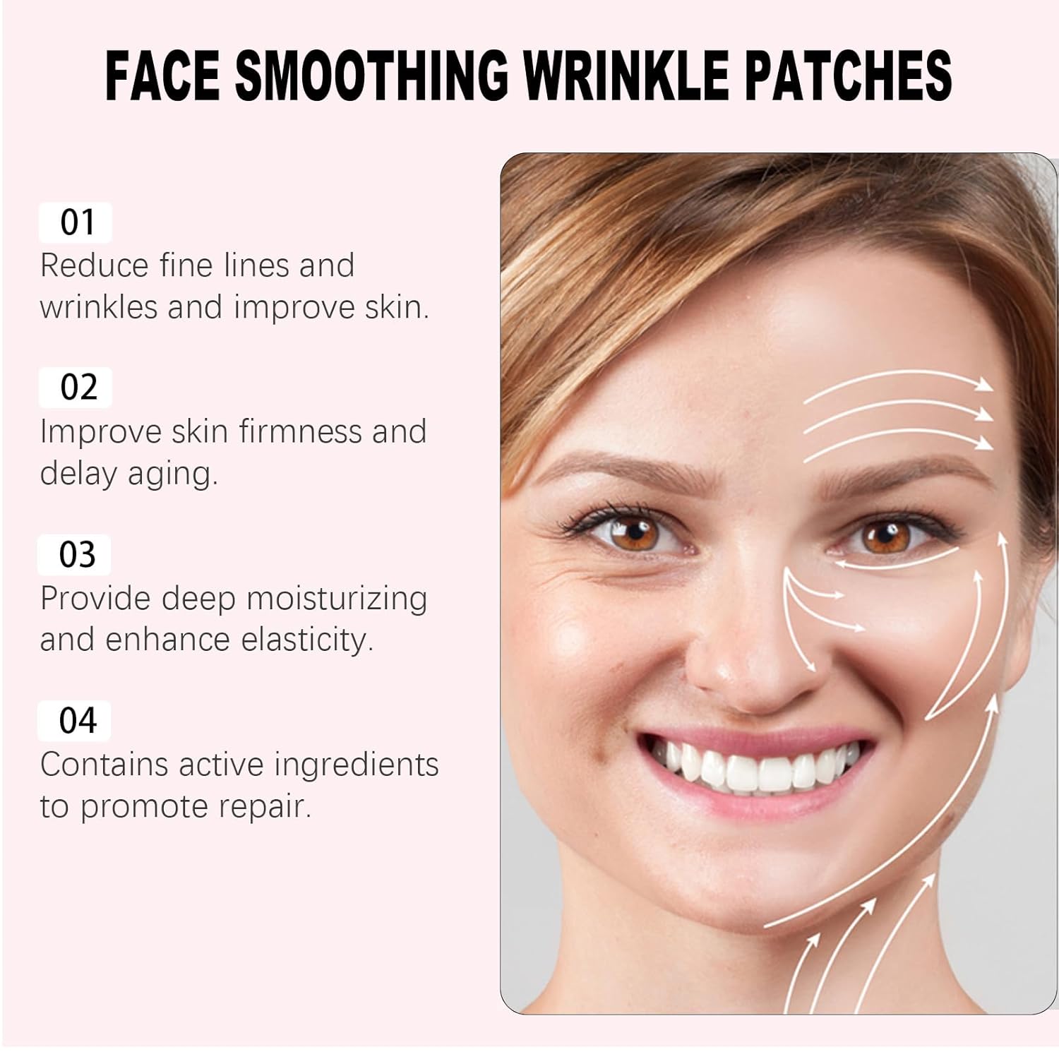 Product Benefits: CONVENIENT ANYTIME CARE:Whether at home or traveling, the facial patches ensure consistent anti-wrinkle care that fits your lifestyle., Effectively reduce the appearance of forehead wrinkles, while improving skin structure and firmness, making the skin younger and smoother. Unleash the full potential of your skin, FACIAL WRINKLE SMOOTHING:The facial wrinkle patches are designed to minimize the appearance of facial wrinkles and smile lines, promoting a more refined and younger complexion., ONGOING OVERNIGHT SKINCARE: Provides continuous lifting and hydration to your skin throughout the night, allowing you to wake up with plump and firmer skin., SMILE LINE MINIMIZATION:Specifically targets the smile lines around the mouth area, helping to reduce their visibility and tighten the skin., Wrinkle patch for reducing wrinkles, anti-aging, moisturizing and smiling wrinkles See more