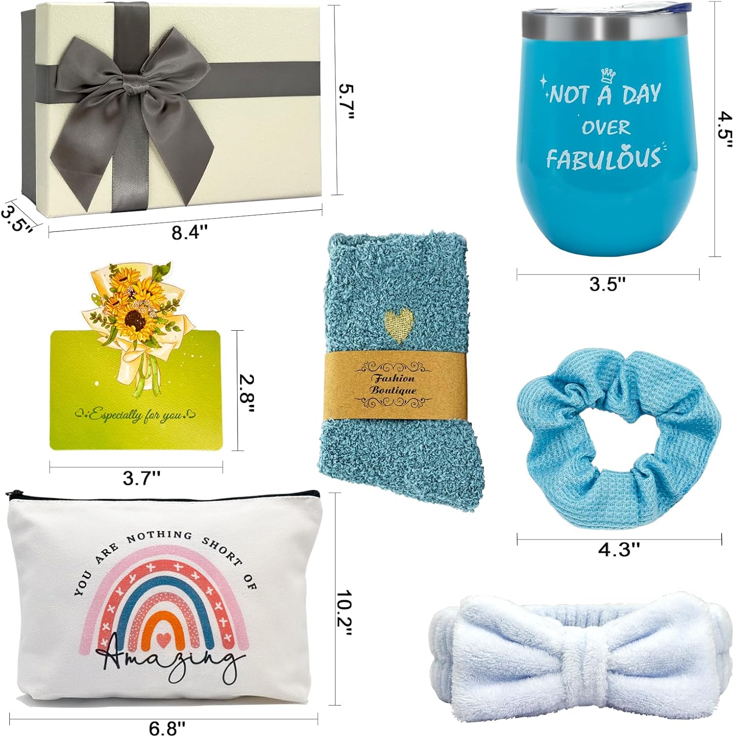 Gift set for women: The happy birthday gifts contain a 12oz tumbler, a canvas bag, a pair of socks, a hair tie, a headband, and a greeting card, all of which are life-enhancing