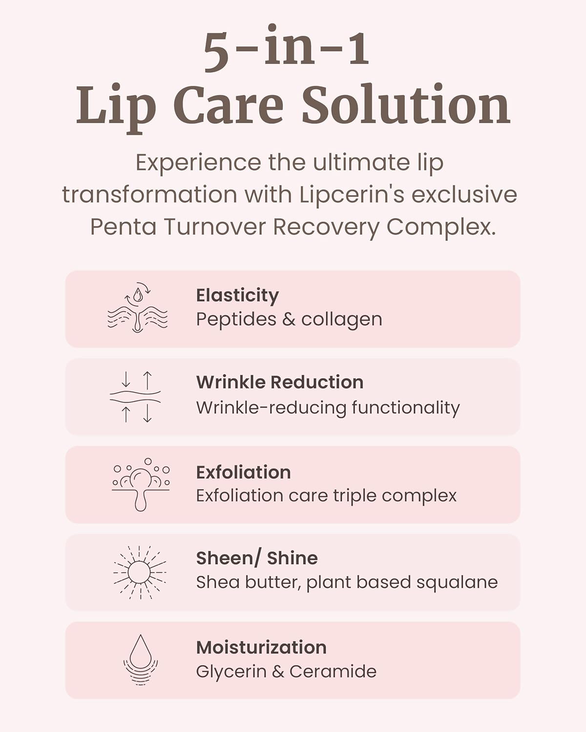 5-IN-1 LIP SOLUTION - Experience the ultimate lip transformation with Lipcerin's exclusive Penta Turnover Recovery Complex. This advanced lip balm offers a comprehensive solution to enhance your lips, focusing on five key benefits: soothing chapped lips, reducing wrinkles, providing deep moisturization, improving elasticity, and delivering a glossy finish.