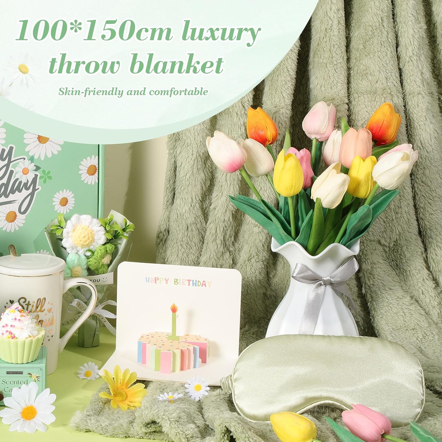 【A Complete Self-Care 11-Piece gift basket for Women】Pamper her with everything she needs to unwind! This comprehensive happy birthday gift basket for women includes a cozy fleece blanket, a calming aromatherapy candle, relaxing bath salts, a nourishing handmade soap, a practical makeup pouch, a heartfelt birthday card, a stylish ceramic mug, and a delicate bracelet. It's the ultimate self care gifts for women package designed for total pampering.