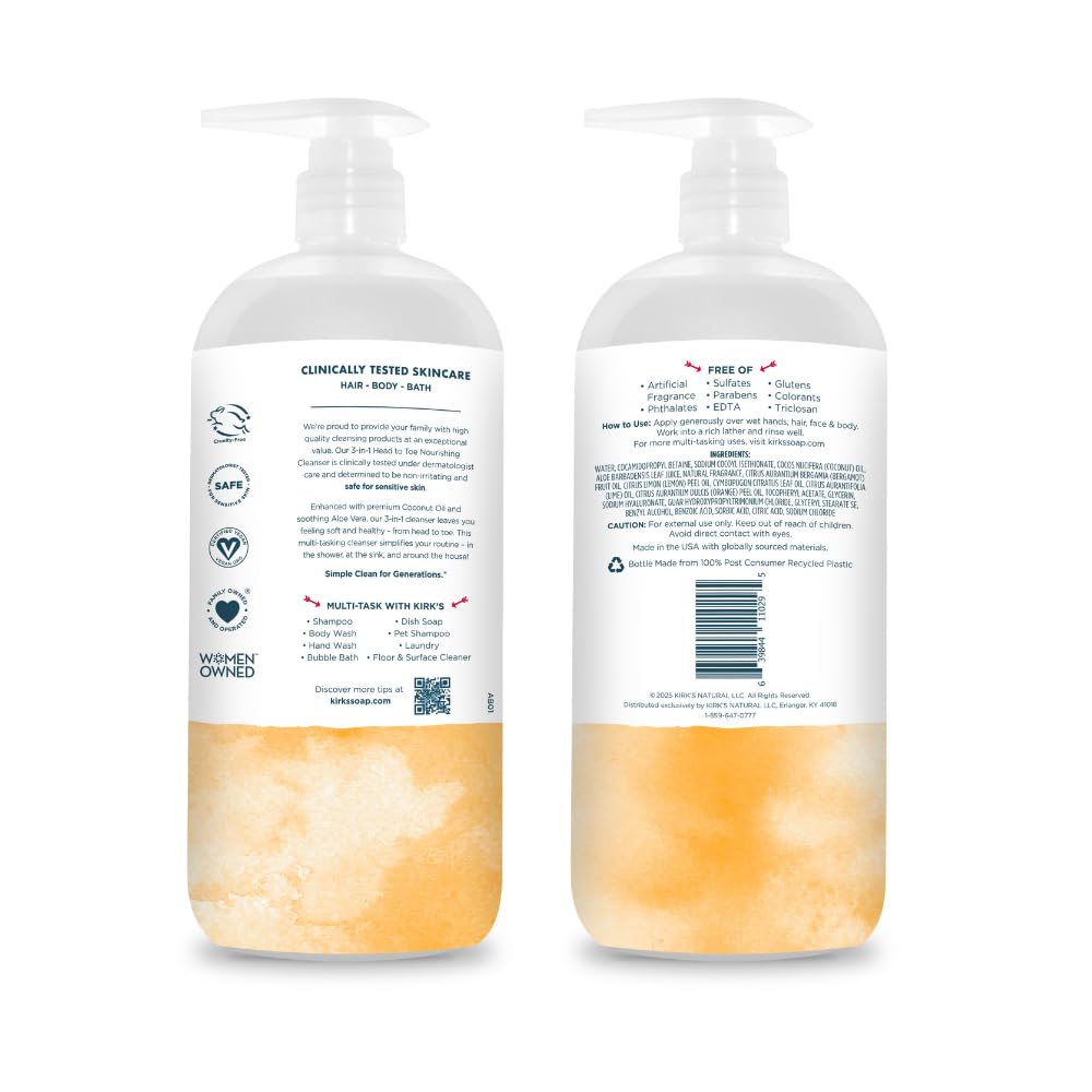 SENSITIVE SKIN FRIENDLY Our 3 in 1 is clinically tested, safe for sensitive skin. Free of Sulfates, Parabens, Phthalates, EDTA, Artificial Fragrance, Colorants, Gluten, Non-GMO project verified and Vegan. Kirk’s Nourishing Cleanser is great for the whole family! Sold in a convenient 32 oz. pump bottle.
