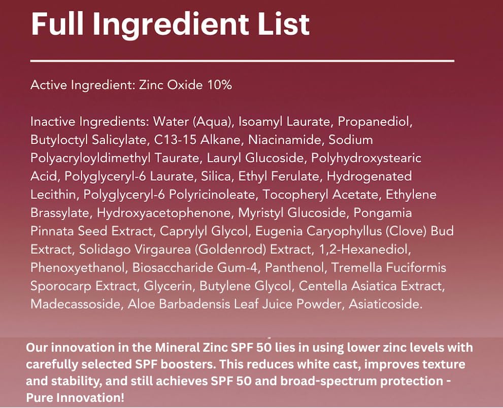 [SENSITIVE SKIN SAFE, REEF SAFE, VEGAN - FDA OTC REGISTERED] Free from oxybenzone, octinoxate, artificial fragrance/colorants. Featuring 10% Zinc Oxide, a gentle, naturally occurring mineral that reflects both UVA and UVB rays, providing a protective barrier without irritation or absorption. Gentle enough for even the most sensitive skin, including eczema, rosacea, and acne-prone skin.
