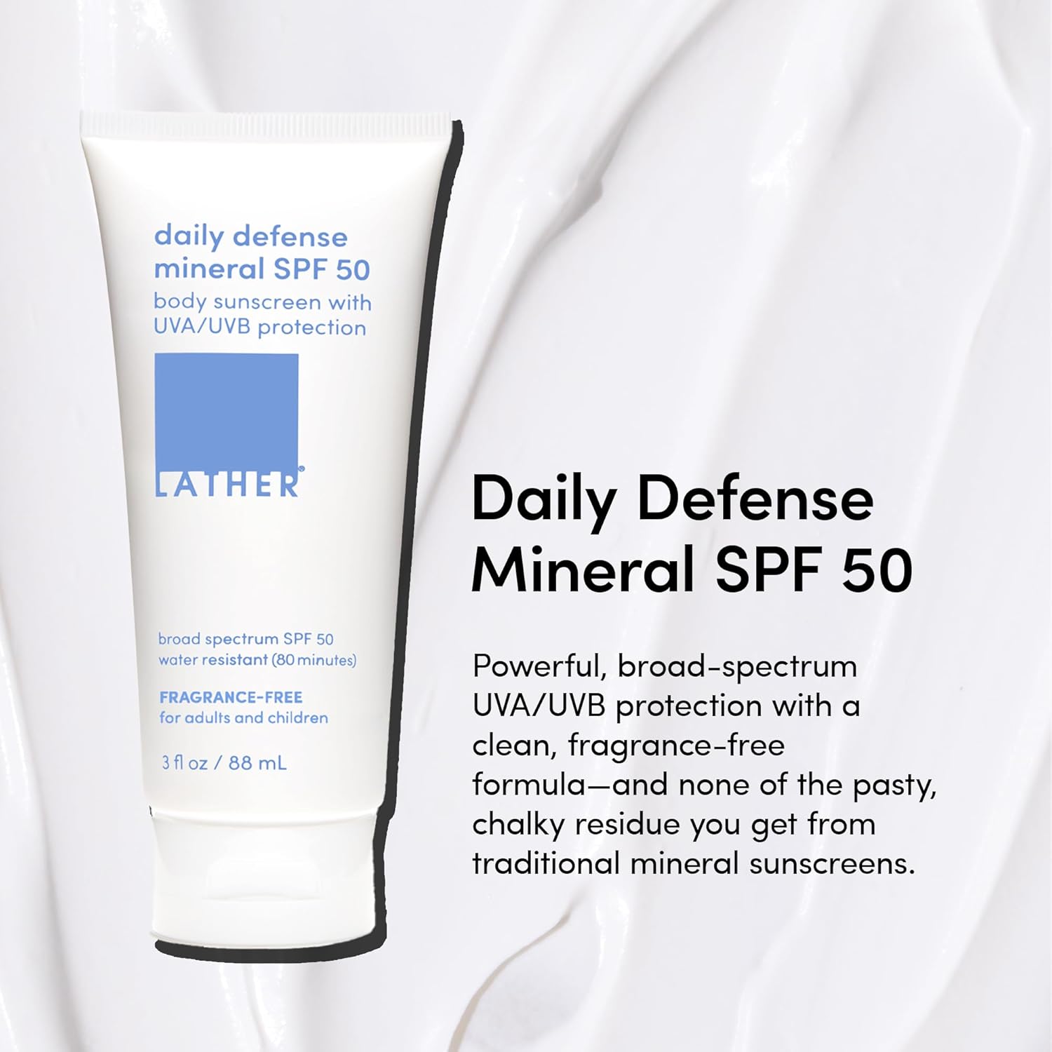 LATHER - Daily Defense Mineral SPF 50 Body Sunscreen, 3 oz - Safe for Family & Sensitive Skin - Fragrance Free, Water Resistant - Zinc Oxide & Shea Butter - Vegan & Cruelty Free - Beauty & Skin Care