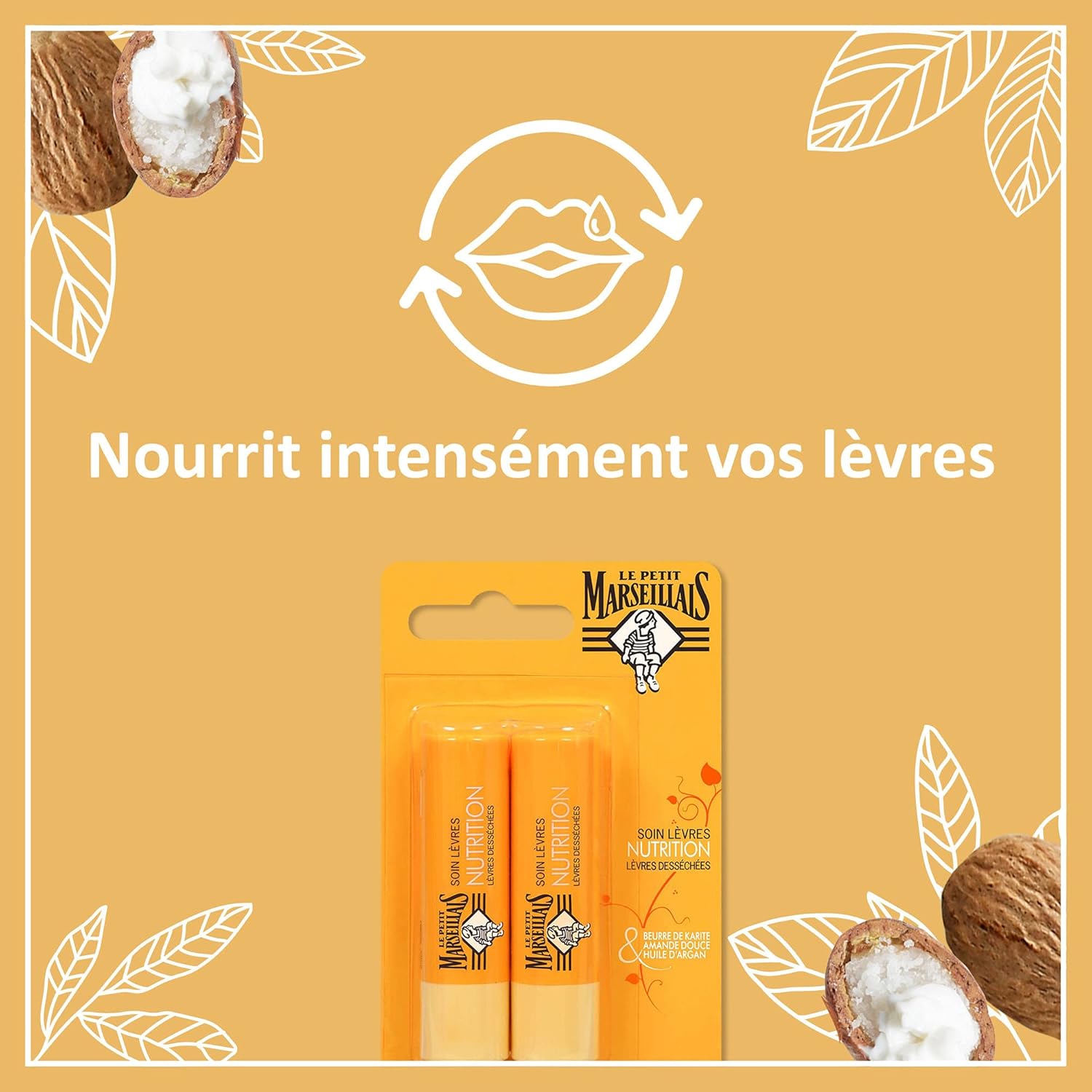 Le Petit Marseillais | Soin Lèvres Nutrition Lèvres Desséchées (2 tubes de 4,9 g) – Baume à lèvres au beurre de karité, amande douce et huile d'argan – Stick à lèvres nourrissant