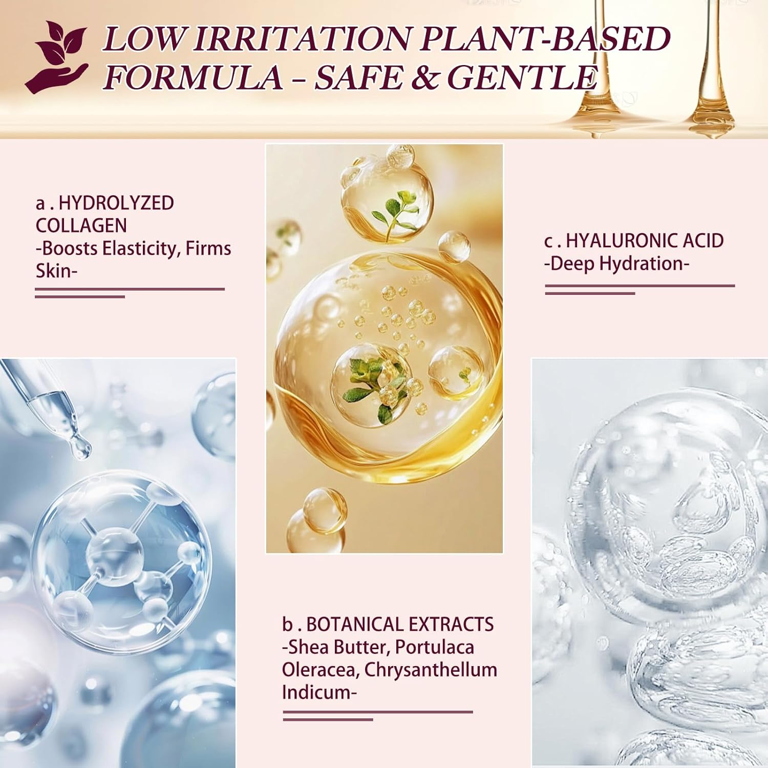Deeply Moisturizes & Softens Wrinkles –– With an effective blend of absorbable hydrolyzed collagen, hyaluronic acid, and plant-derived essences, this formula locks moisture into the skin, tightens the forehead, and smooths out fine lines. It also works on smile lines, lip, crow's feet, and other facial wrinkles. Think of it as a hybrid of a face mask and wrinkle treatment, plump & smooth in one step.