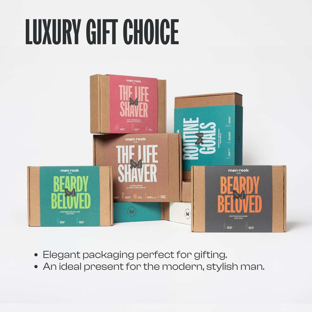 Beard Care Kit for Men: The Men Rock Oak Moss Beardy Beloved Soothing Beard Kit includes a Beard Shampoo, Beard Balm, and Beard Oil. This beard wash set offers a complete grooming solution for a clean, soft, and nourished beard.