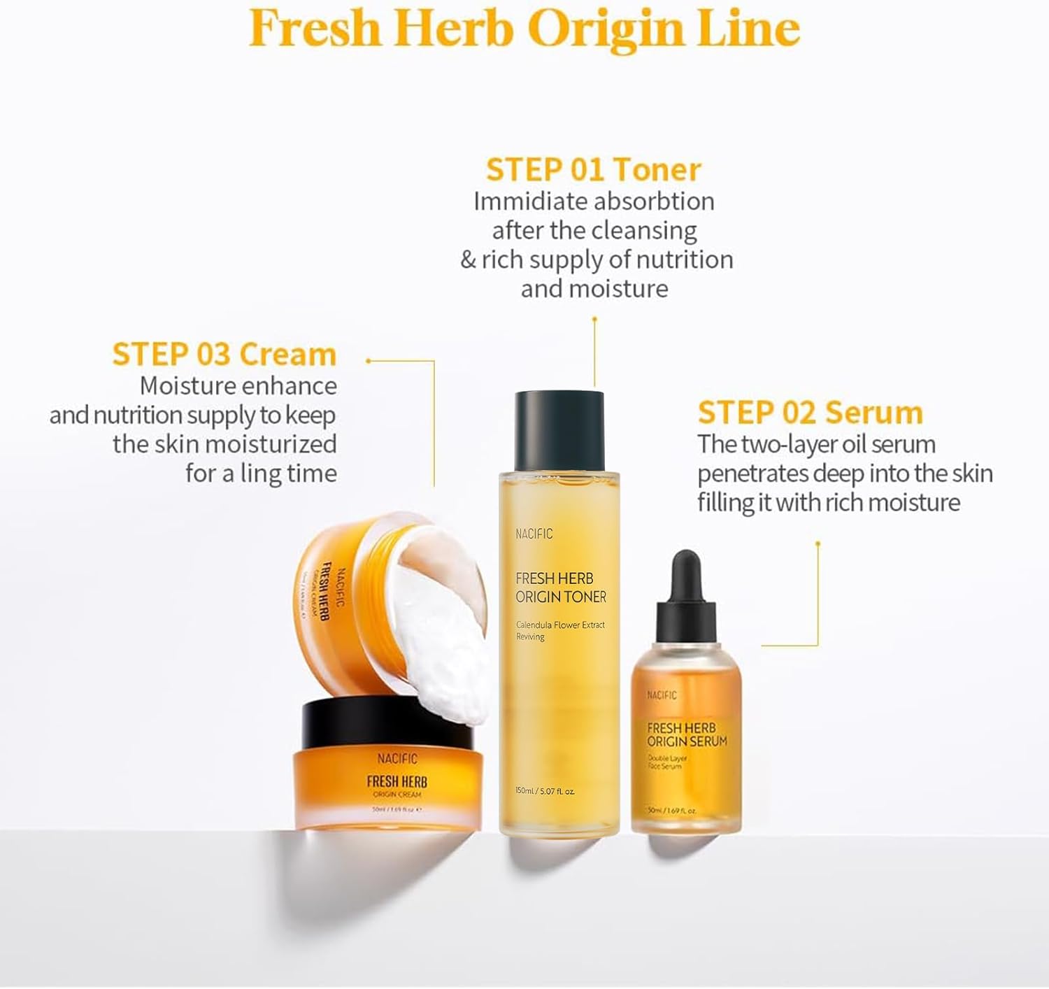 Complete Korean Skincare Set – Includes Fresh Herb Origin Toner (150ml), Serum (50ml), and Cream (50ml) to deliver deep hydration, nourishment, and skin barrier support