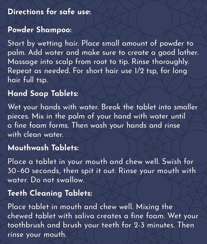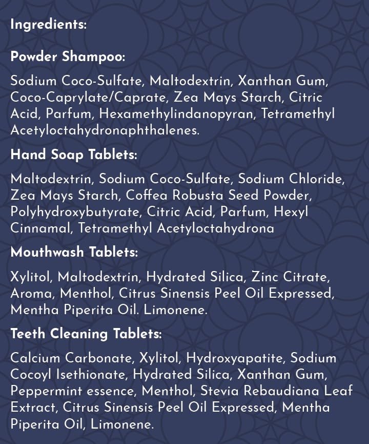 INGREDIENTS: Powder shampoo contains corn starch and dextromalt, while tooth tablets feature hydroxyapatite for gentle yet thorough cleaning