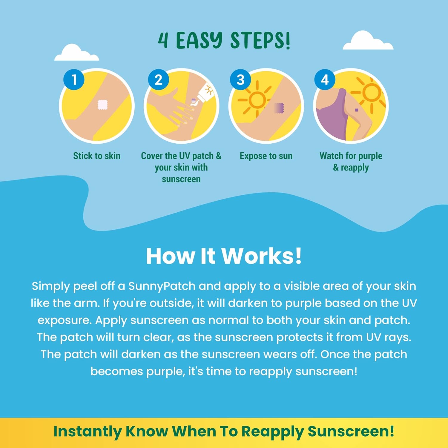 SAFE, EFFECTIVE, AND CHEMICAL FREE - Created with you and your kids in mind. No chemicals or other worrisome ingredients! SunnyPatches are made with dermatologically safe medical adhesive. They have a UV-sensitive layer that reacts to sun rays and turns purple on UV exposure. Waterproof to stay all day long to keep your skin protected form harmful UV rays.