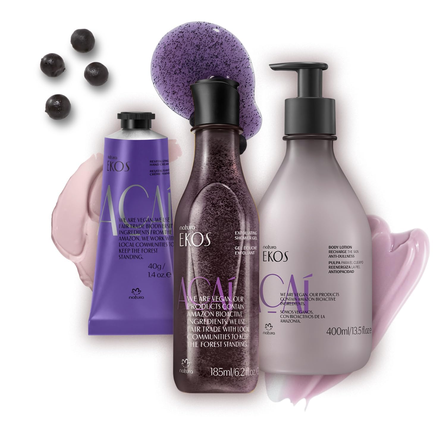 Complete Revitalizing Trio: Includes Açaí Body Lotion (400 ml), Exfoliating Shower Gel (185 ml), and Hand Cream (40 g).