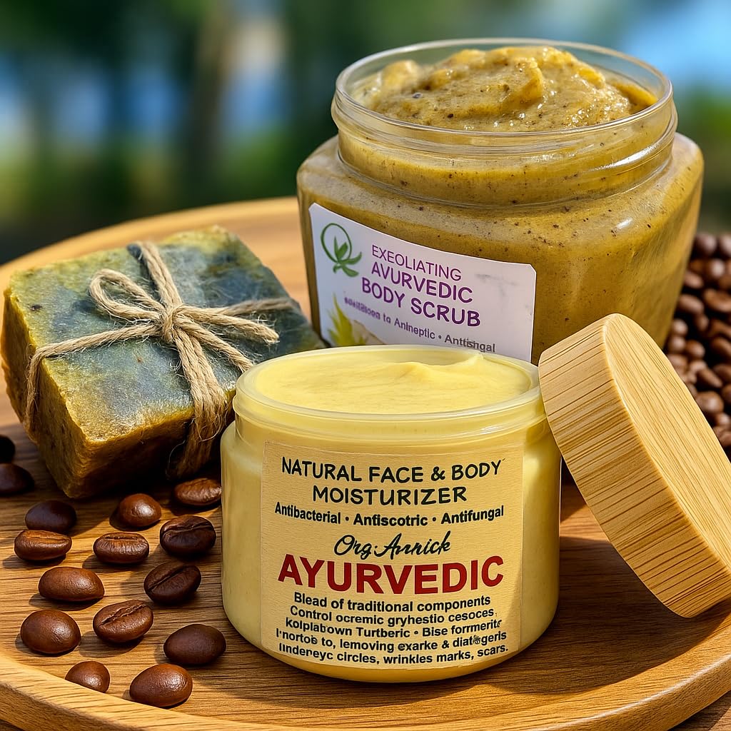 COMPLETE SET: Includes Moisturizing Ayurvedic Repair Cream, Exfoliating Black Soap, and Sugar Coffee Scrub & Mask for a comprehensive skincare routine.