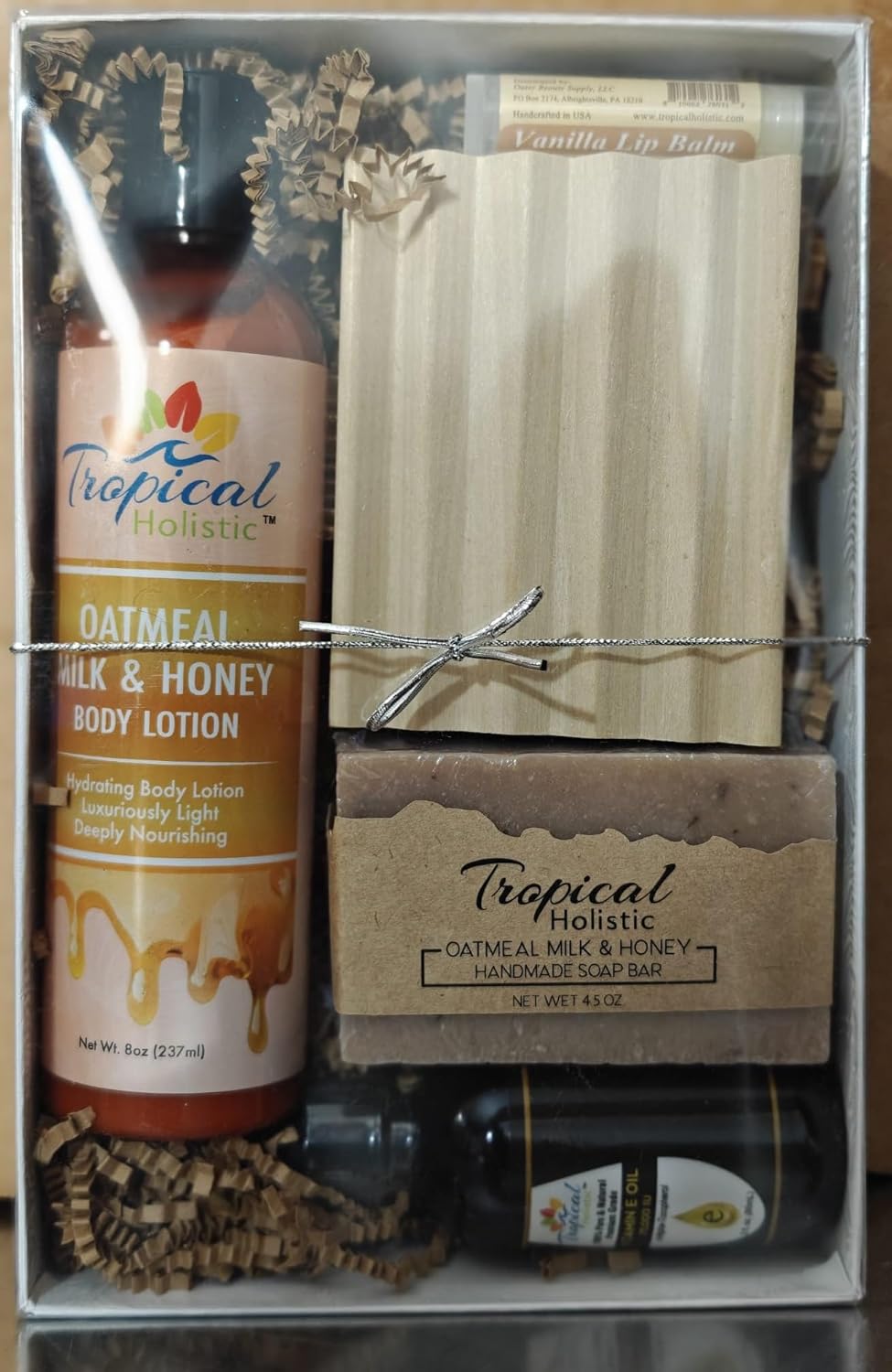 Ultimate Self-Care Collection: Pamper your skin with a curated set featuring Oatmeal Milk & Honey Lotion (8oz), Soap (4.5oz), Vanilla Lip Balm, Premium Vitamin E Oil (2oz), and a Wooden Soap Dish.