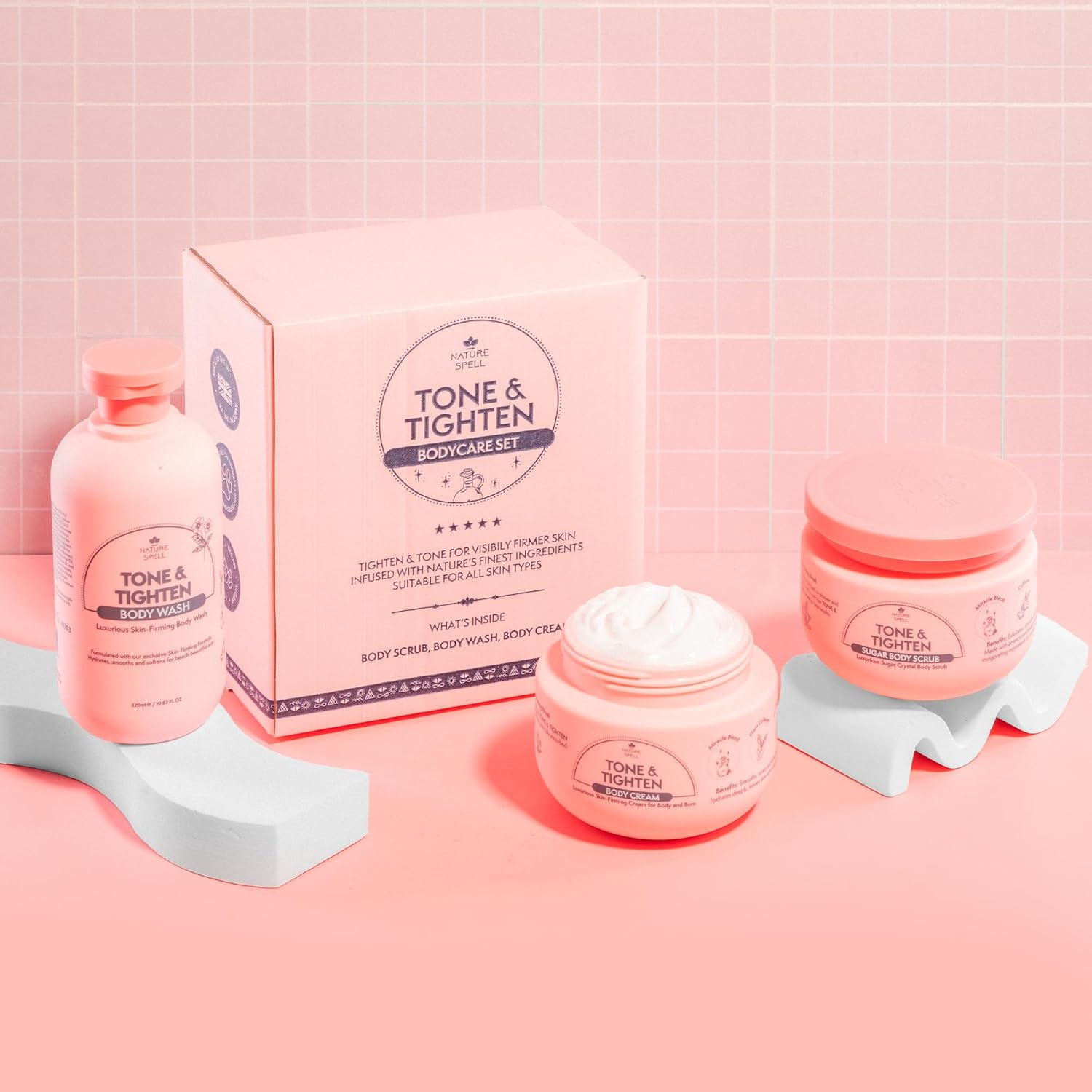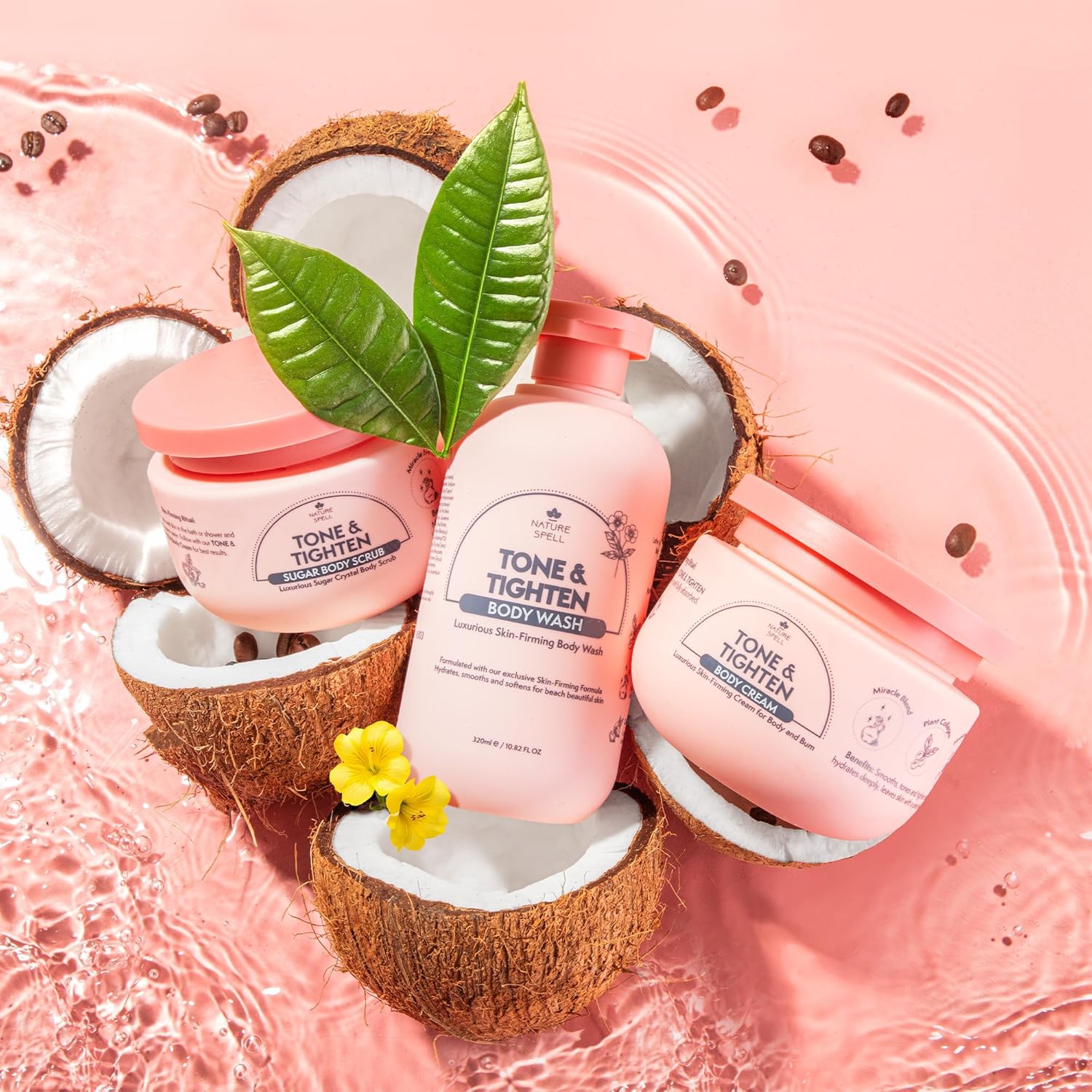 Nature Spell Tone & Tighten Body Care Gift Set for Women, Body Wash, Sugar Scrub and Cream with Hyaluronic Acid, Ginseng Extract and Plant Collagen, for All Skin Types, Vegan, Set of 3