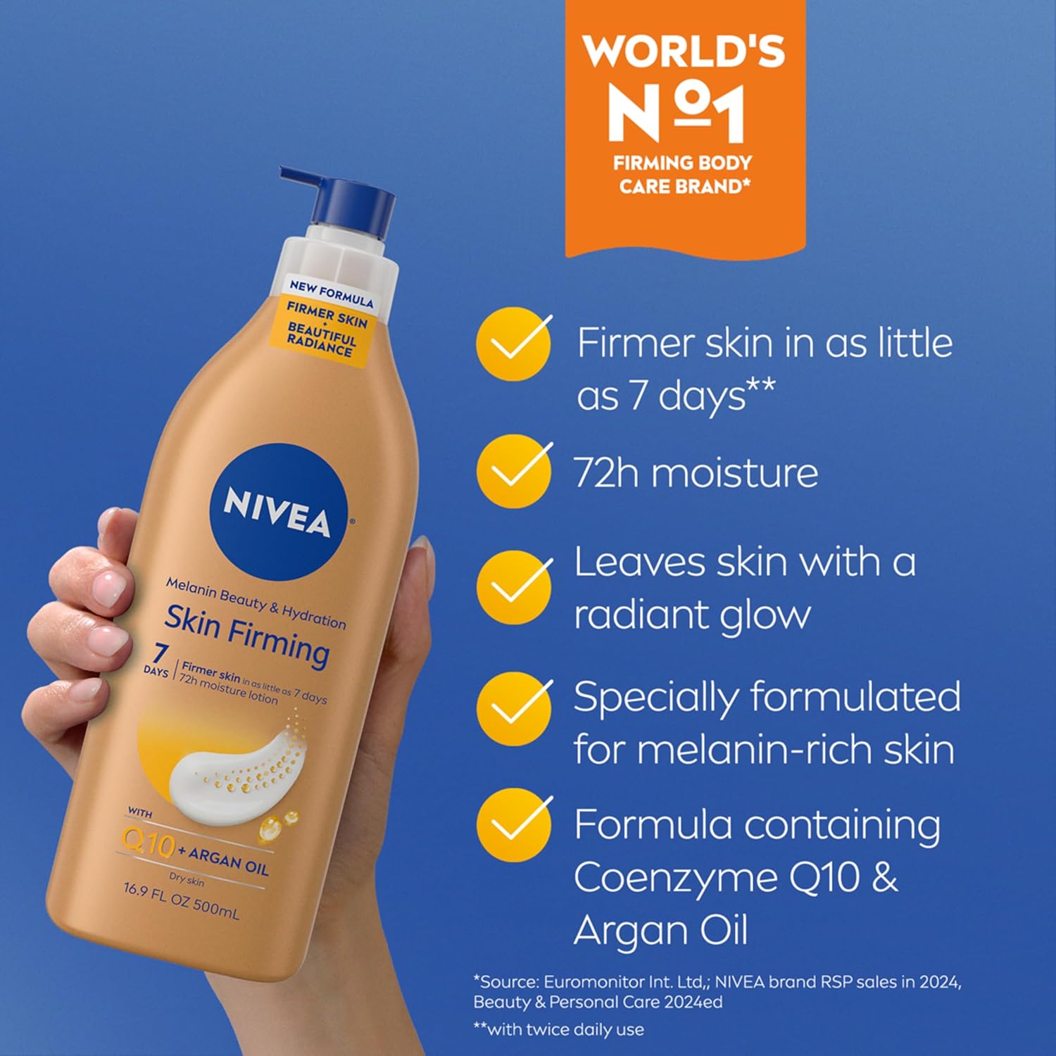 NIVEA Skin Firming Melanin Beauty & Hydration Body Lotion with Q10 and Argan Oil, Firmer Skin in as Little As Seven Days, 16.9 Fl Oz Pump Bottle