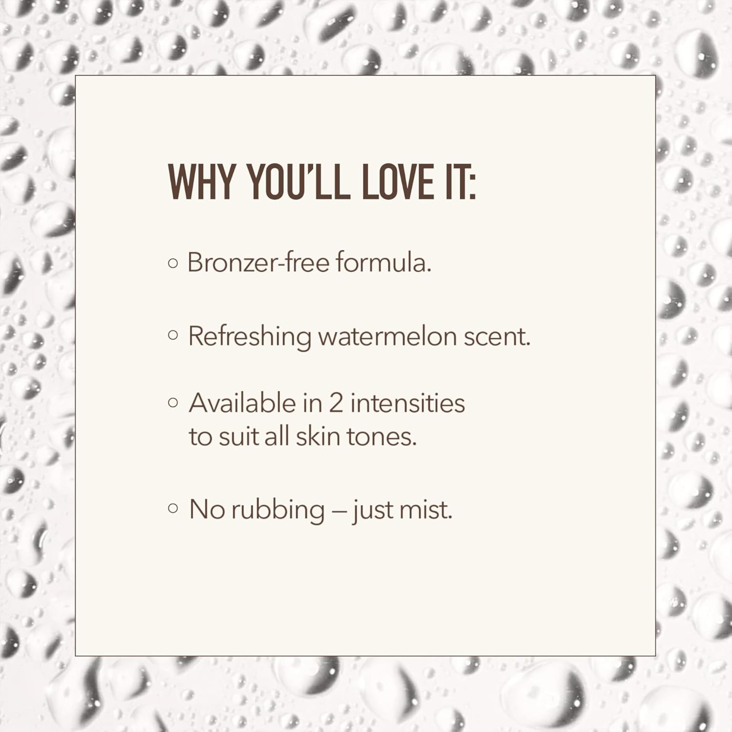 CLEAN, REFRESHING & STREAK-FREE FINISH: Featuring a lightweight, bronzer-free formula, this alcohol-free tanning mist offers a transfer-free, mess-free experience with a refreshing watermelon scent. It’s non-comedogenic, non-sticky, and suitable for AM or PM application—perfect for layering under or over skin care and makeup without streaking or staining fabrics.