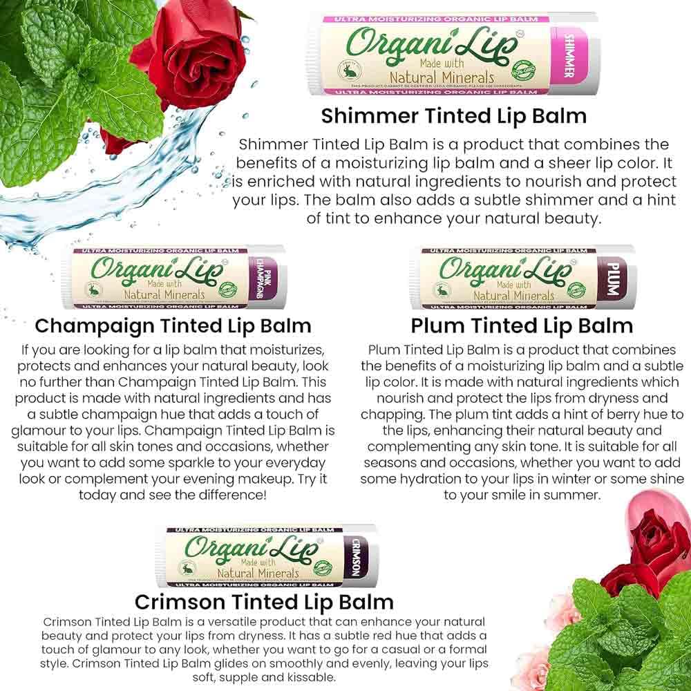 OrganiLip Tinted Lip Balm Moisturizer - Natural Moisturizer for Cracked & Dry Lips - All-Day Ultra Moisturizing Lip Care for Kids and Adults - Shimmer, Pink Champagne, Crimson, Plum Colors - 4 Pack
