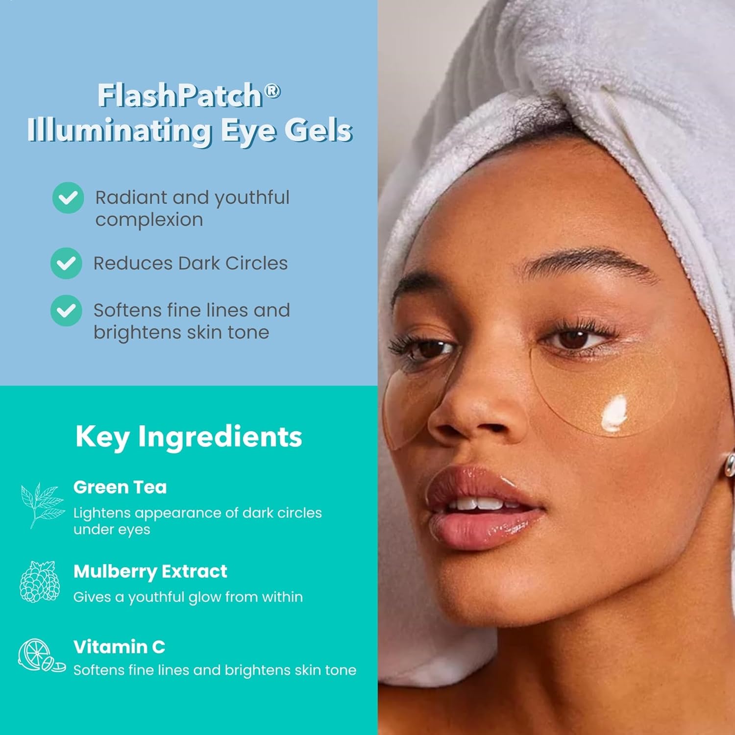 HYDRATING & SMOOTHING EYE TREATMENT – Our FlashPatch Illuminating Eye Gels, enriched with Green Tea, Mulberry Extract, and HydraSurge5 technology, provide targeted care for tired eyes. With ingredients like Caffeine and Portulaca Oleracea Extract, these eye gels enhance the look of brightness, while Centella Asiatica supports skin elasticity for a firmer under-eye area. Perfect for addressing puffiness, dark circles, and fine lines.