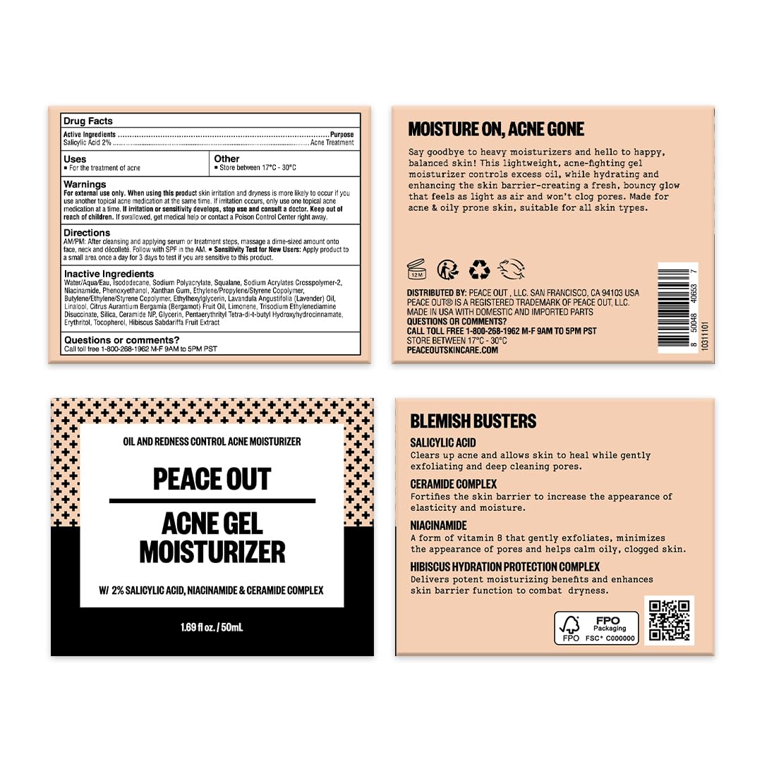 PEACE OUT Skincare Acne Gel Moisturizer, For Daily Facial Use with Salicylic Acid & Niacinamide, Boost Hydration and Help Prevent Acne & Blackheads, for Men & Women, 1.69 fl oz
