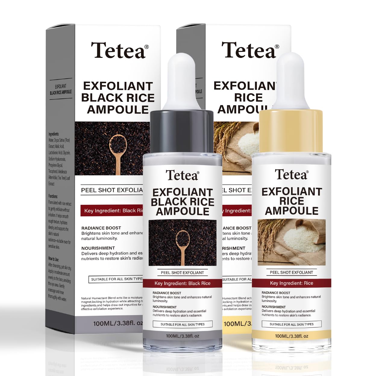 Dual Rice Exfoliating Formula : Two complementary ampoules , white rice for radiance, black rice for pore care , designed to gently exfoliate dead skin cells and refine texture with consistent daily use.