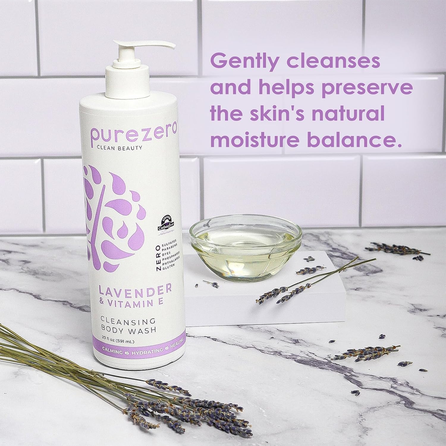 Purezero Lavender & Vitamin E Body Wash, Calms and Invigorates Skin - Leaves Skin Hydrated, Maintain Elasticity and Smoothness, Zero Sulfates, Parabens, or Dyes (20oz, 2 Pack)