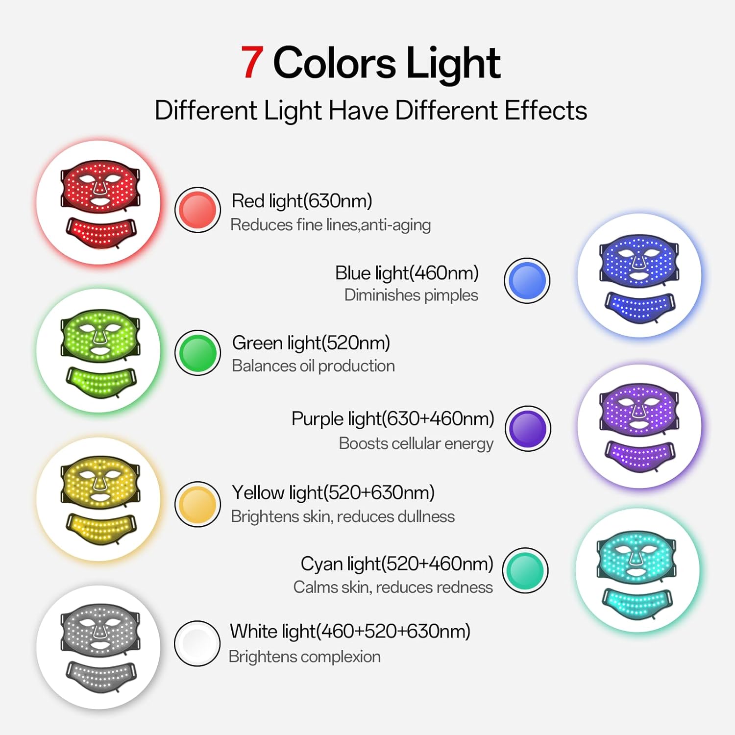 7 Light Modes: The Facego Red Light Mask features 7 distinct colors (Red, Green, Blue, Purple, Orange, Cyan, White) with an automated cycle, each tailored to address specific skin concerns, providing versatile care for your skincare routine.