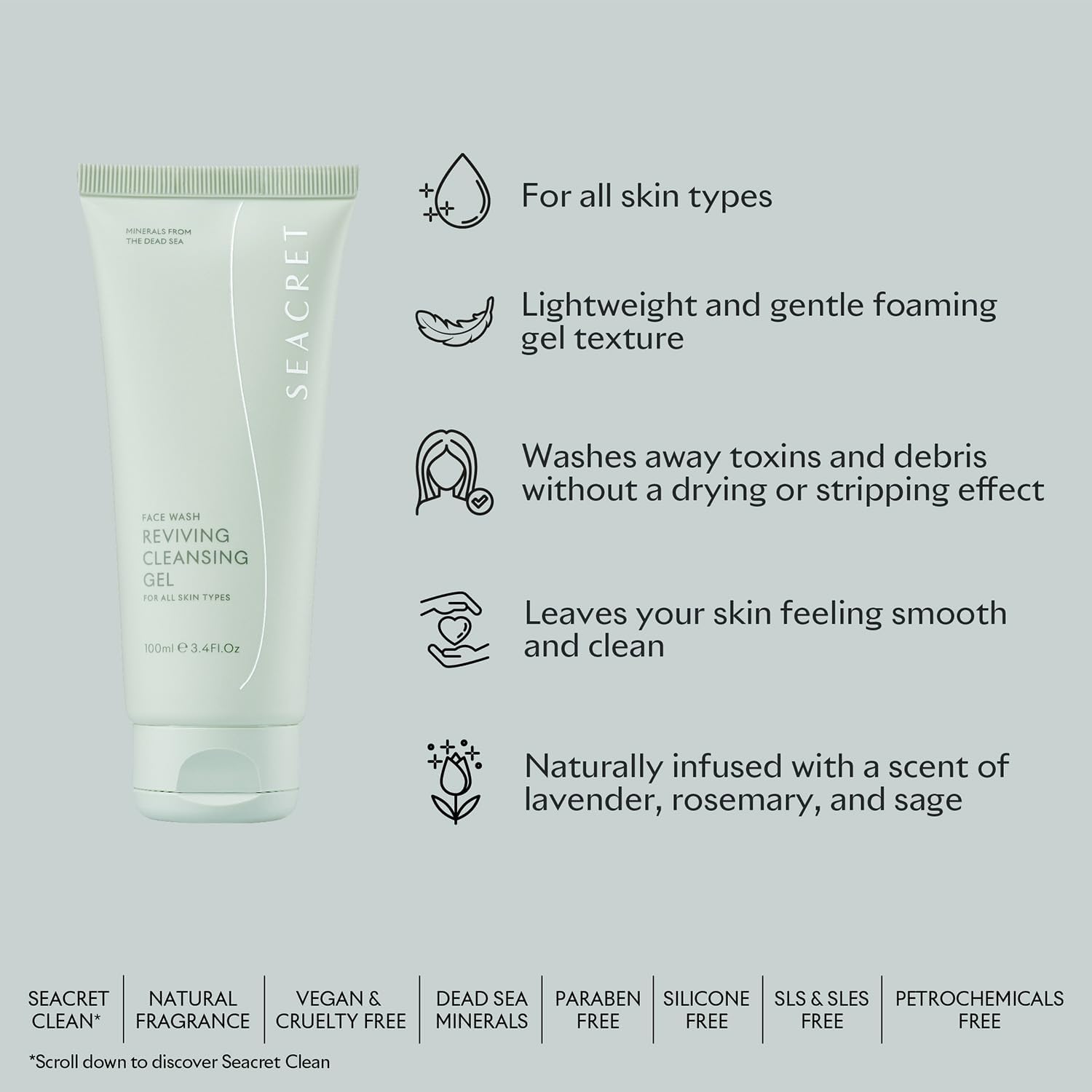 SEACRET Reviving Cleansing Gel – Gentle Face Wash for Women | Facial Cleanser with AHA | Hydrating & Rejuvenating Skin Cleanser | Naturally Scented with Lavender, Rosemary & Sage Aroma | 4.2 fl oz