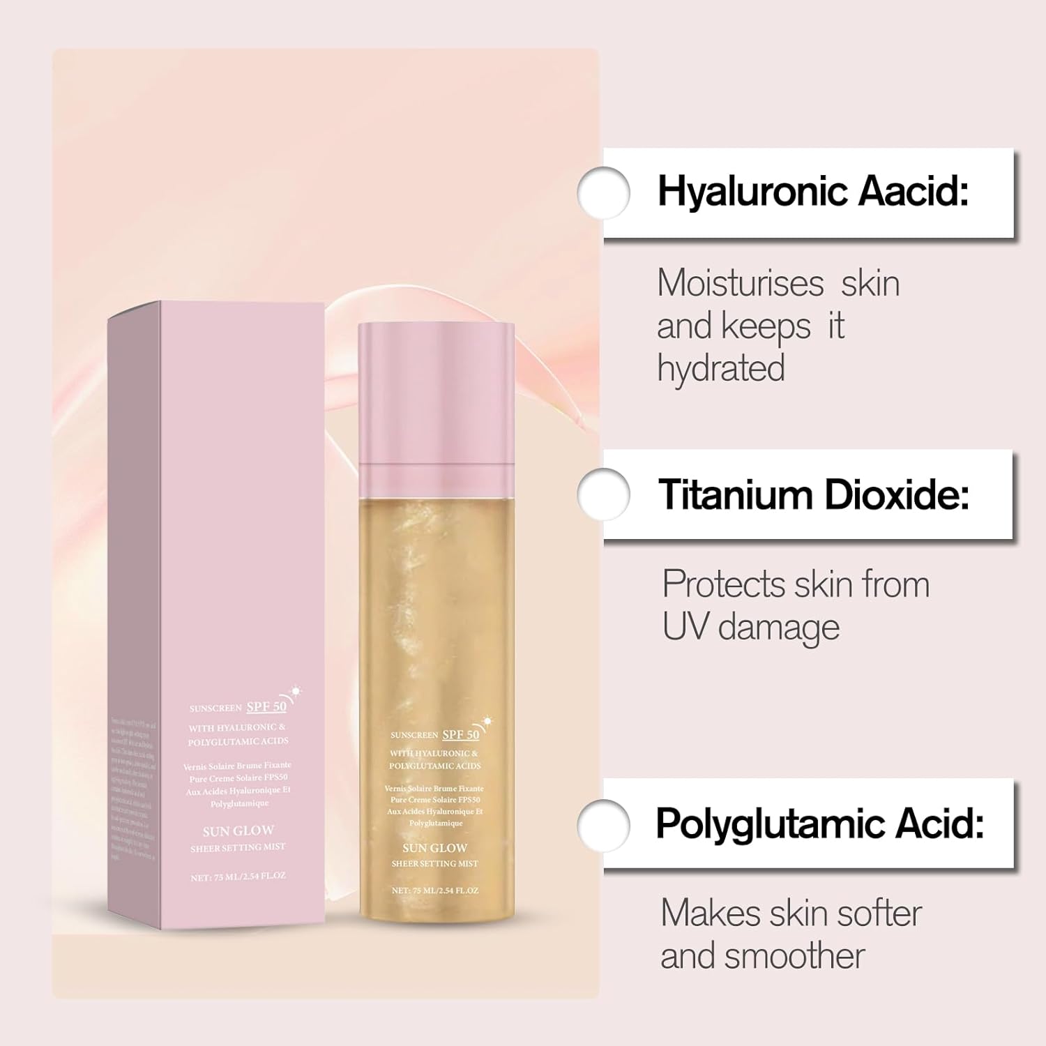 Sunglaze Sheer Setting Mist Sunscreen SPF 50 for Face & Body, Broad Spectrum Shimmering Body Oil Spray, Hydrating, Fast Absorbing & Non-Greasy Spray, Makeup-Friendly, 2.54 fl.oz(2.54 Fl Oz (Pack of 1))